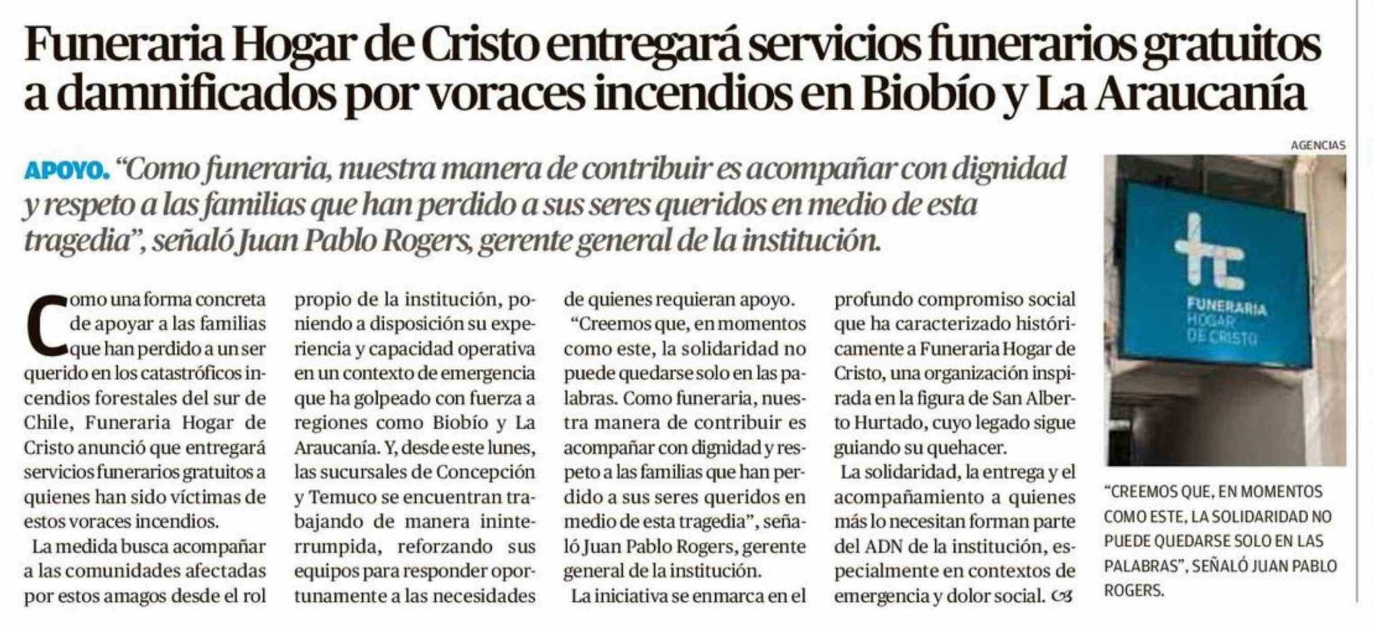 | Título: | Funeraria Hogar de Cristo entregará servicios funerarios gratuitos a damnificados por voraces incendios en Biobio y La Araucanía |
