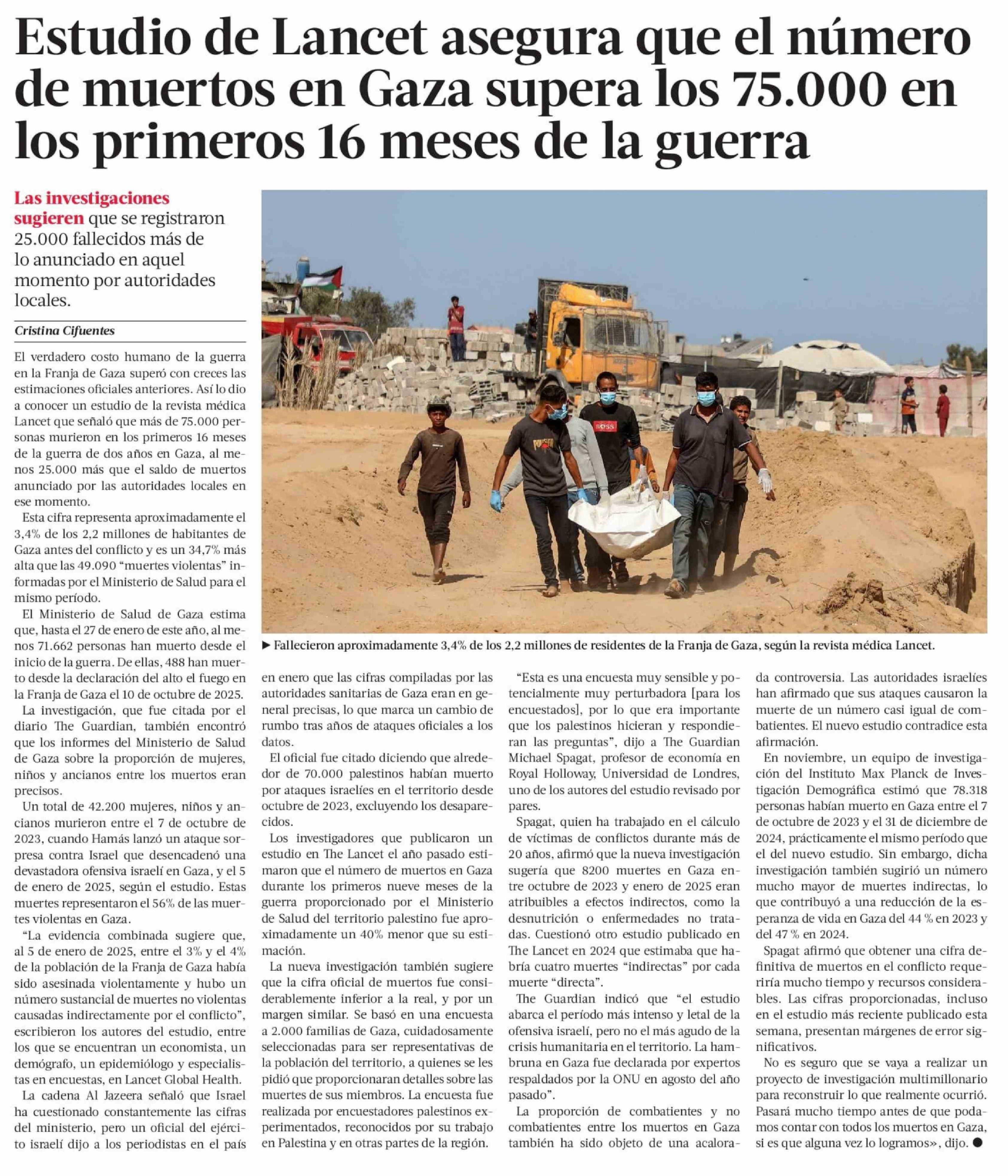 Estudio de Lancet asegura que el número de muertos en Gaza supera los 75.000 en los primeros 16 meses de la guerra