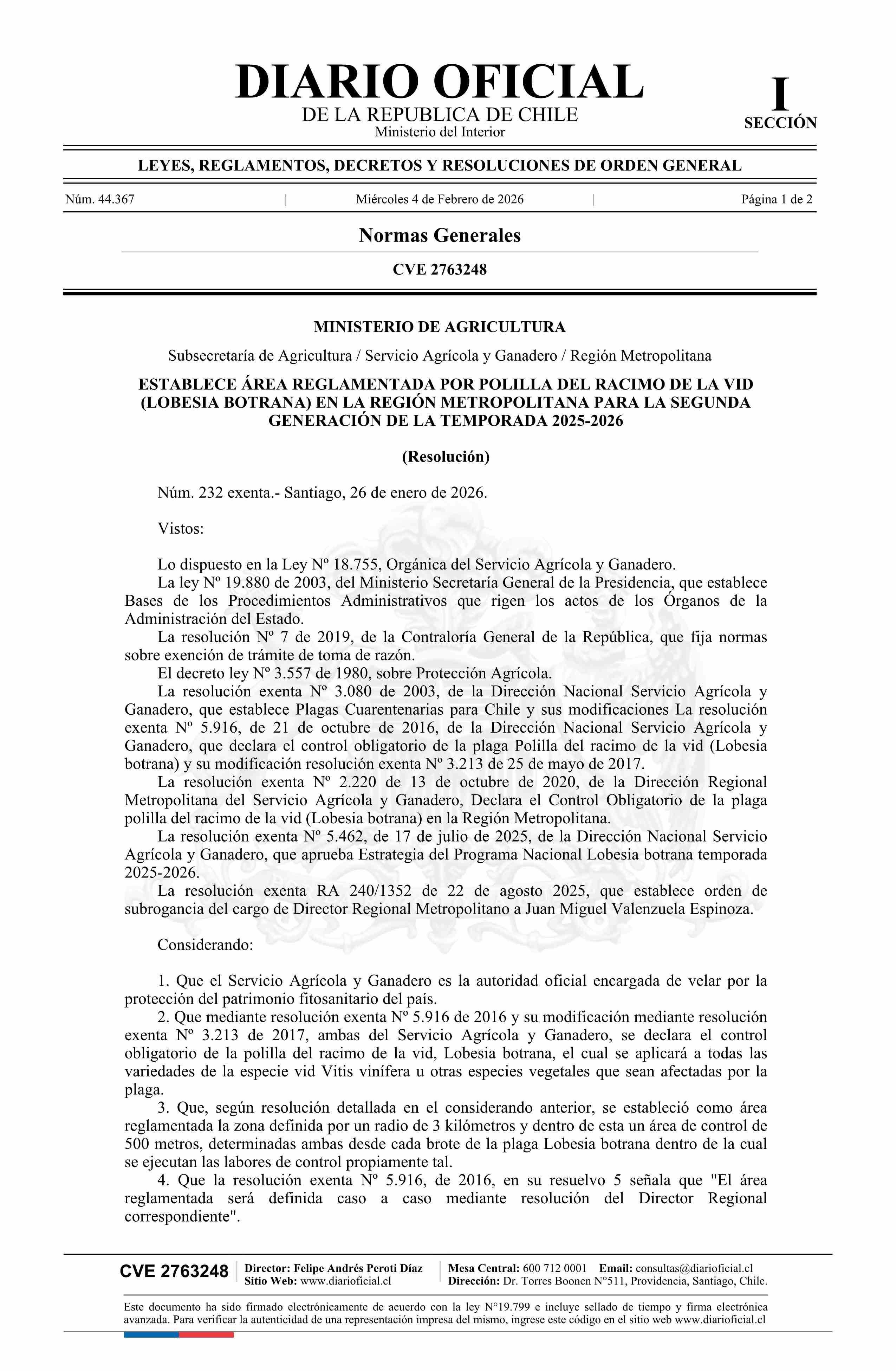 | Título: | Resolución exenta número 232, de 2026.- Establece área reglamentada por Polilla del racimo de la vid (Lobesia botrana) en la Región Metropolitana para la segunda generación de la temporada 2025-2026 |