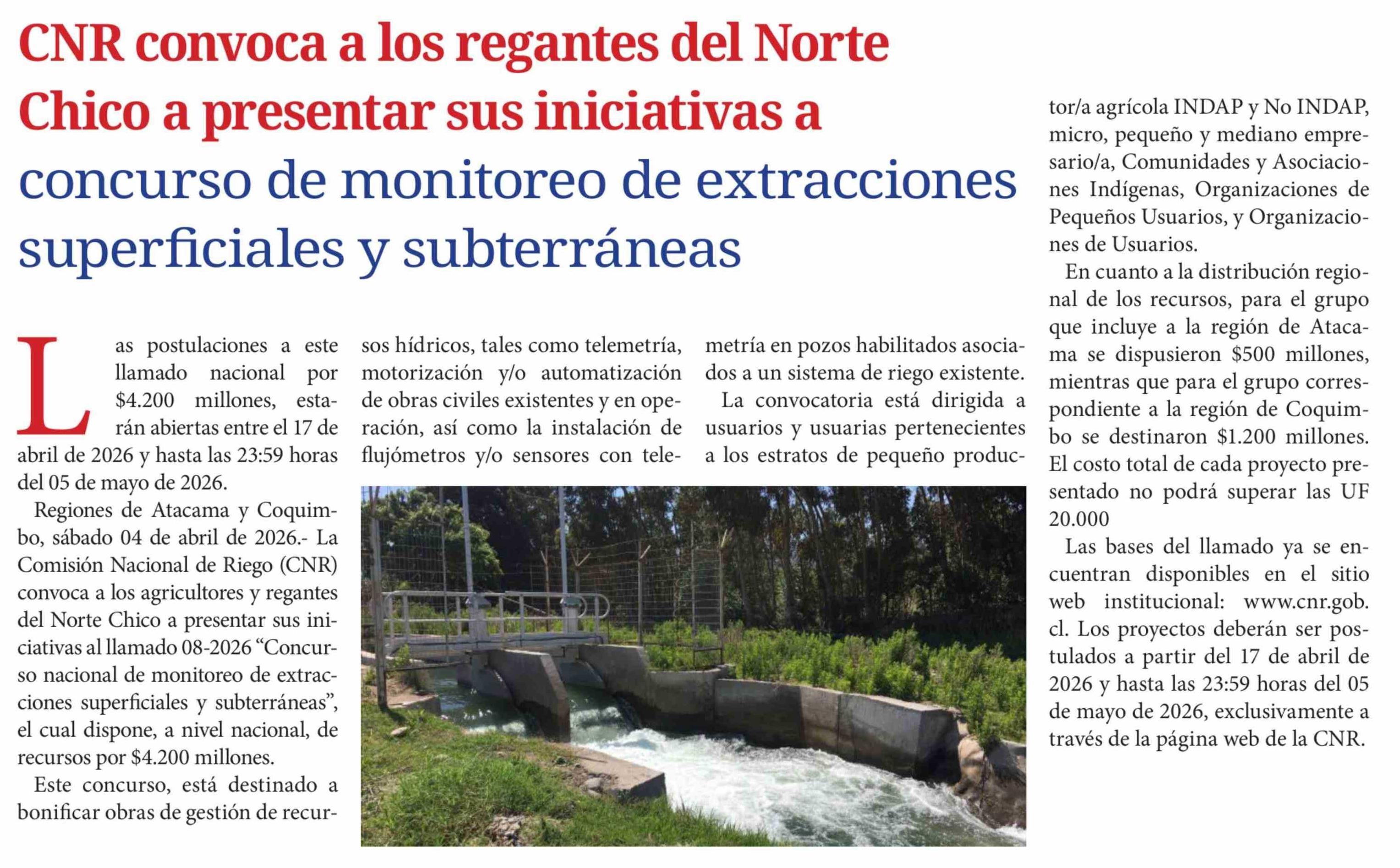 CNR convoca a los regantes del Norte Chico a presentar sus iniciativas a concurso de monitoreo de extracciones superficiales y subterráneas