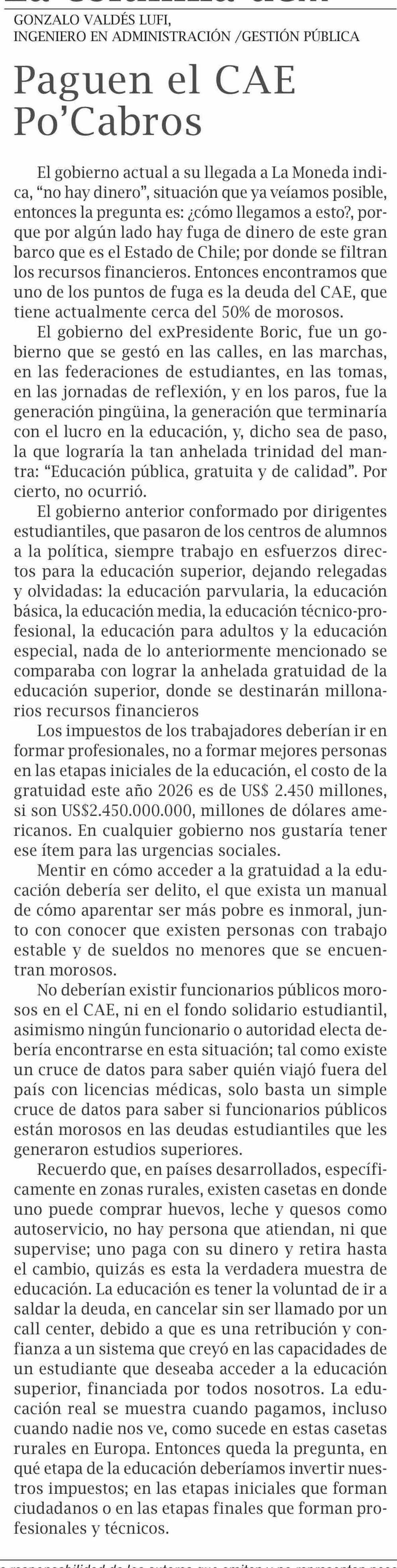 Título: Columnas de Opinión: Paguen el CAE Po’Cabros