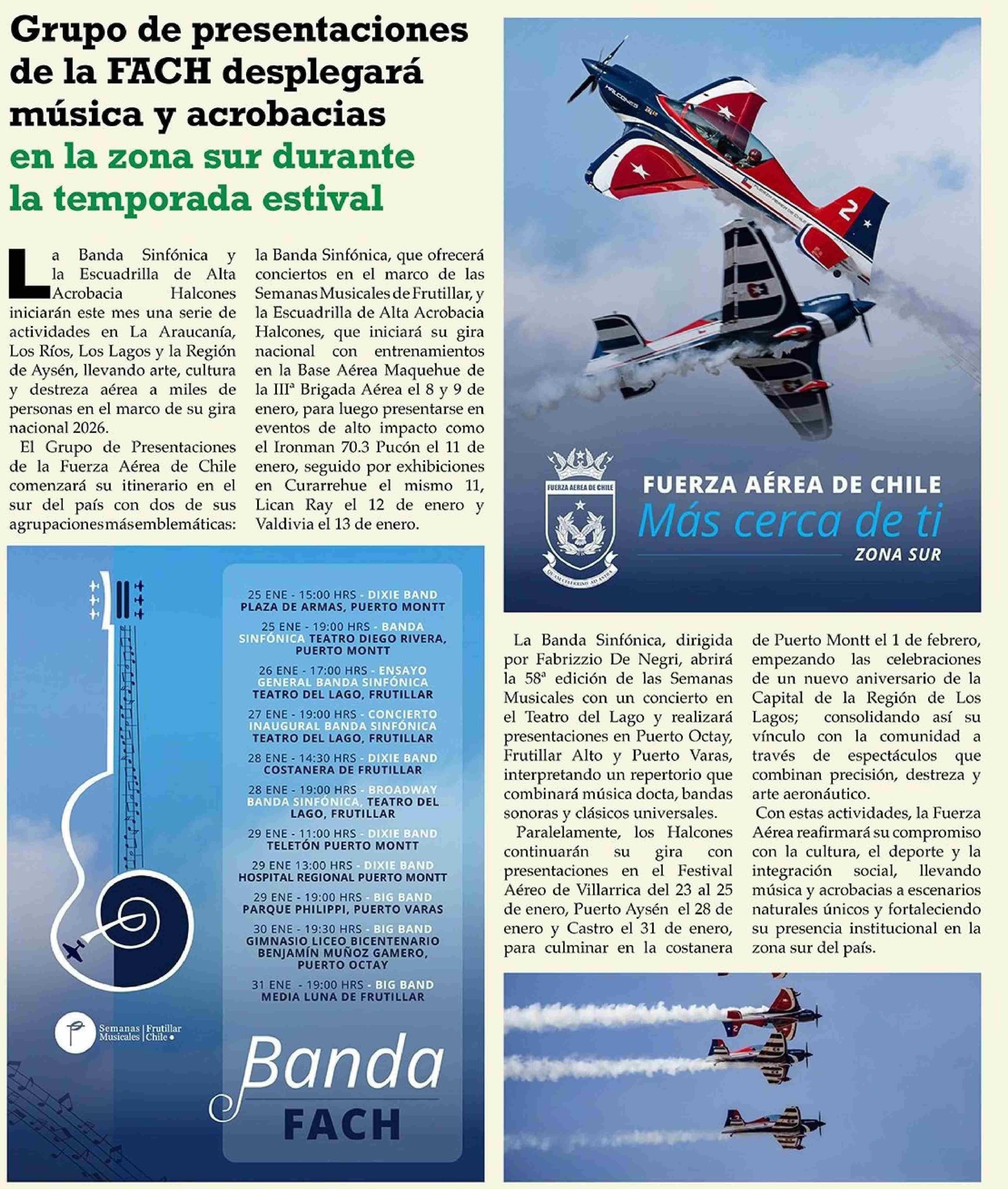 Grupo de presentaciones de la FACH desplegará música y acrobacias en la zona sur durante la temporada estival