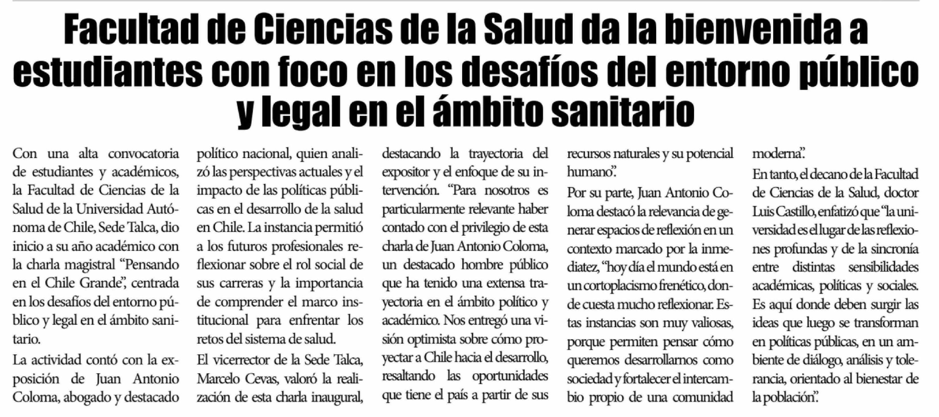 Título: Facultad de Ciencias de la Salud da la bienvenida a estudiantes con foco en los desafíos del entorno público y legal en el ámbito sanitario