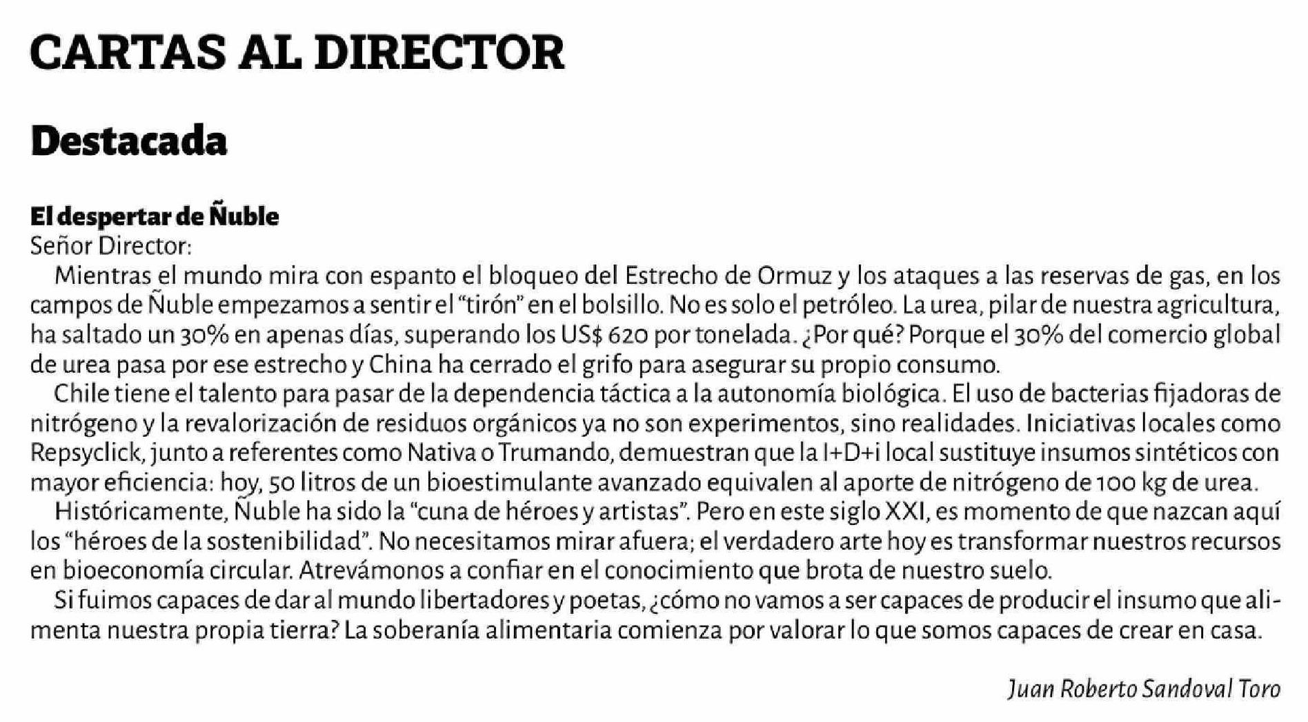| Título: | Cartas: El despertar de Ñuble Señor Director: Mientras el mundo mira con espanto el bloqueo del Estrecho de Ormuz y los ataques a las reservas de gas, en los campos de Nuble empezamos a sentir el "tirón" en el bolsillo. No es solo el petróleo. La urea, pilar de nuestra agricultura, ha saltado un 30% |