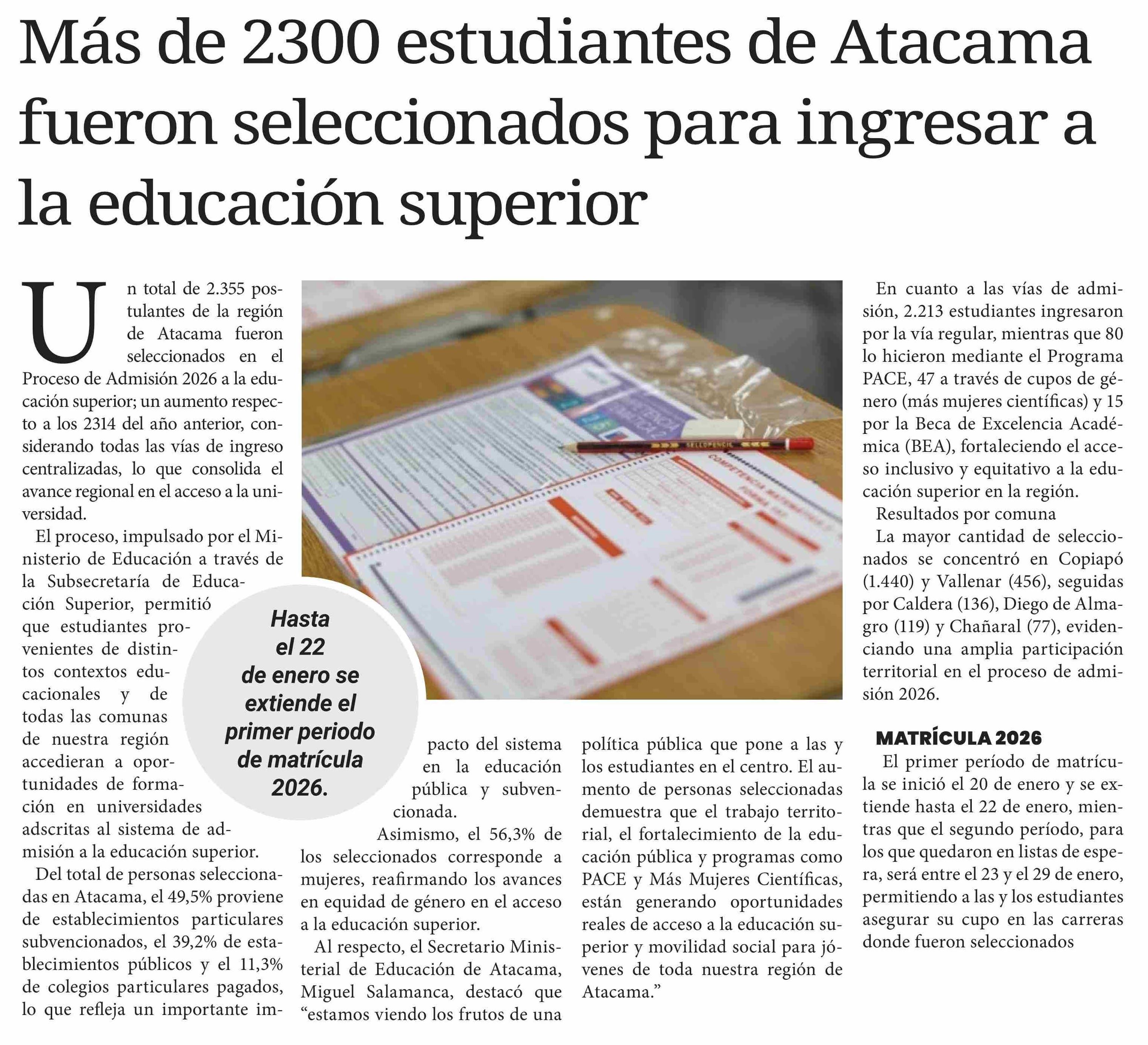 Más de 2300 estudiantes de Atacama fueron seleccionados para ingresar a la educación superior