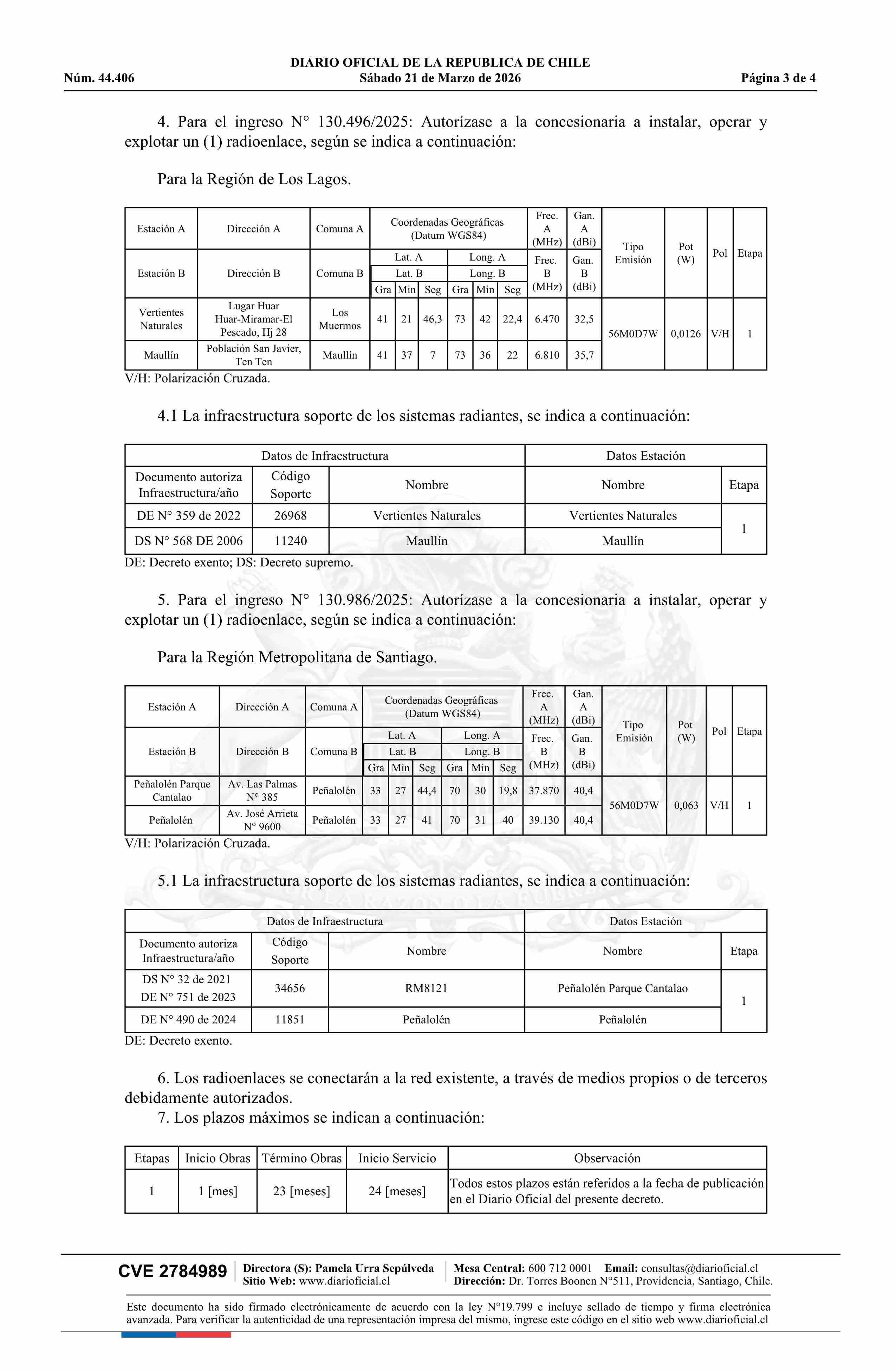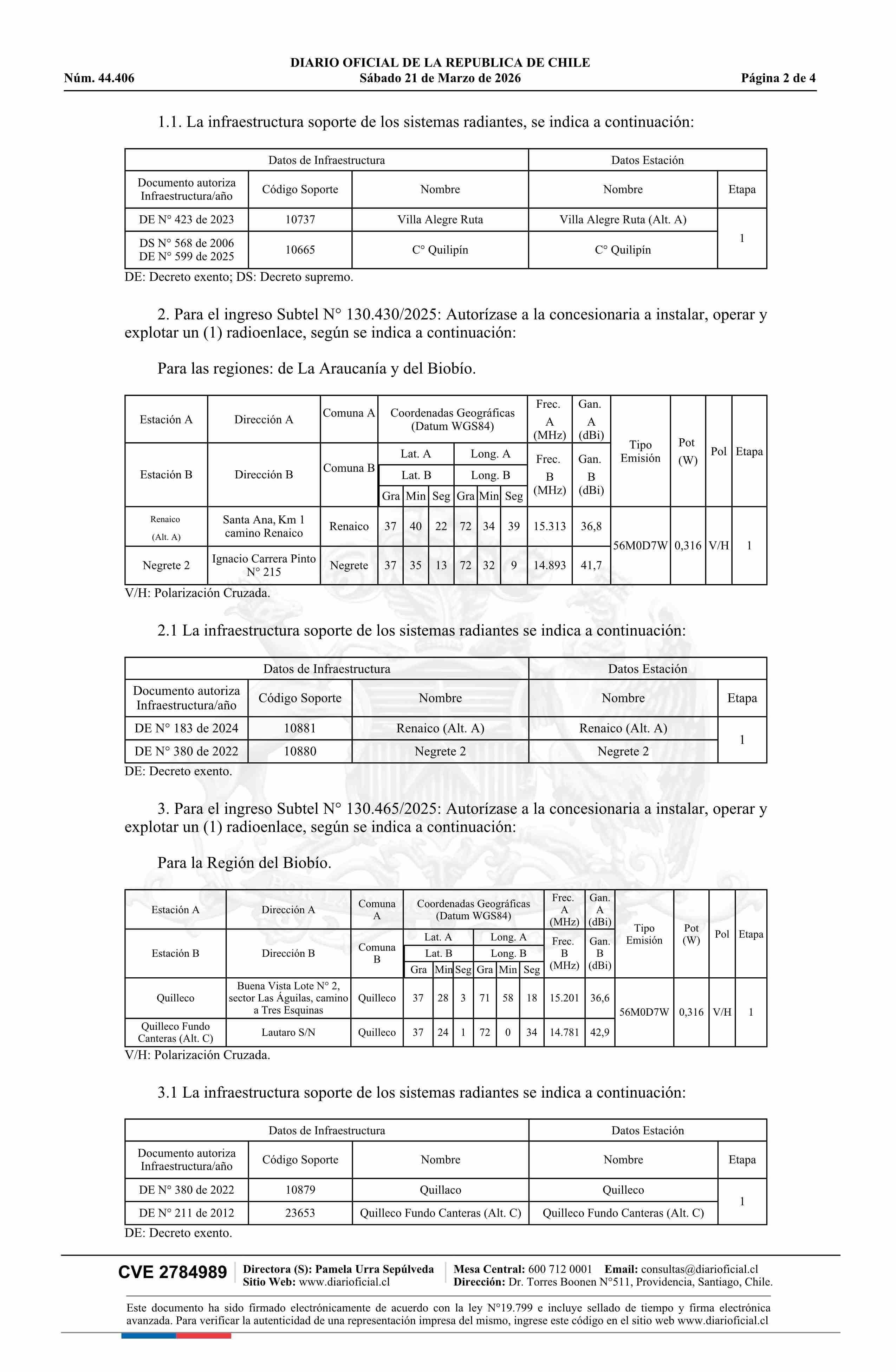 | Título: | Decreto exento número 250, de 2026.- Modifica concesión de servicio intermedio de telecomunicaciones a la empresa Claro Chile SpA |