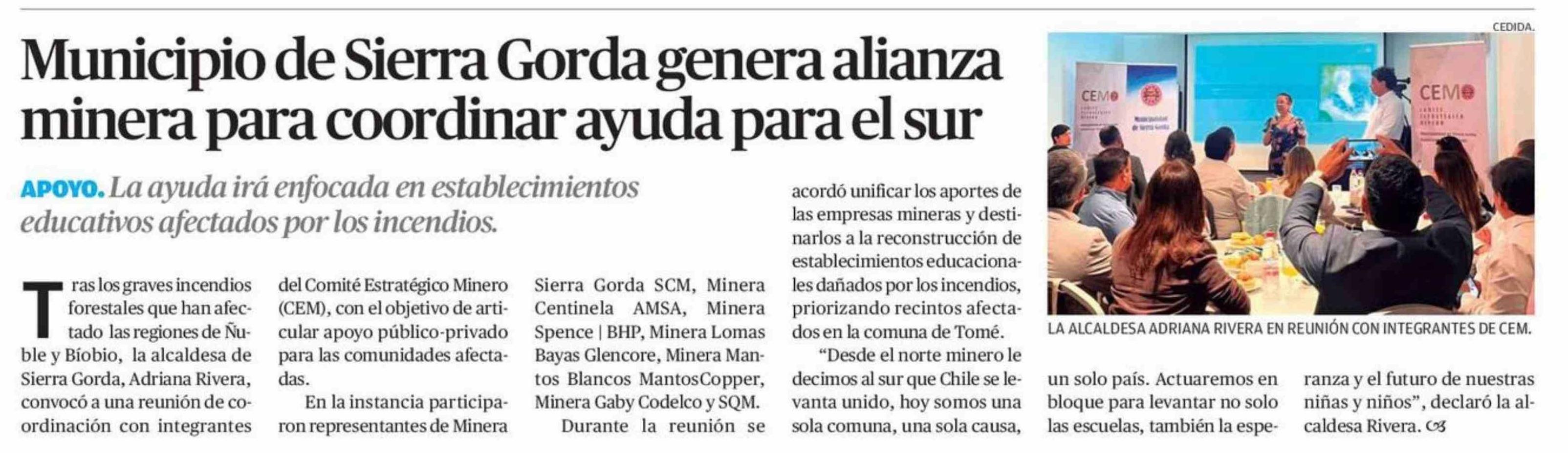 Municipio de Sierra Gorda genera alianza minera para coordinar ayuda para el sur