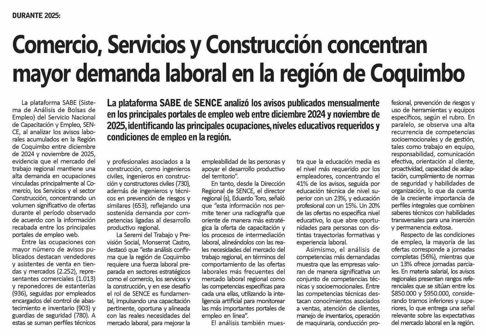 Comercio, Servicios y Construcción concentran mayor demanda laboral en la región de Coquimbo