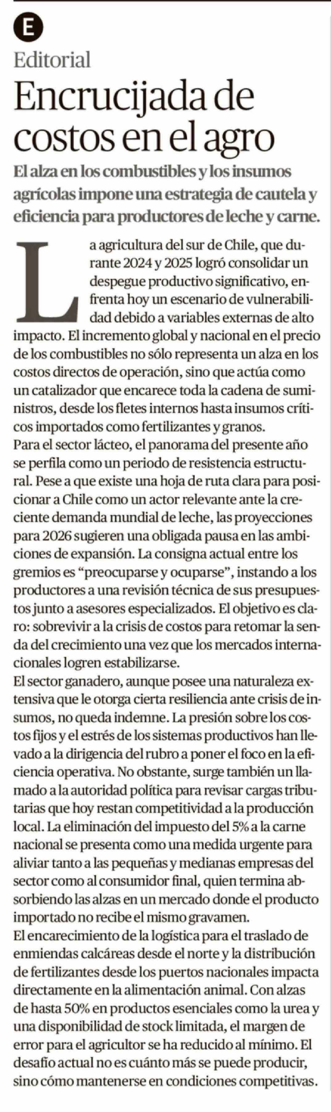 Editorial: Encrucijada de costos en el agro