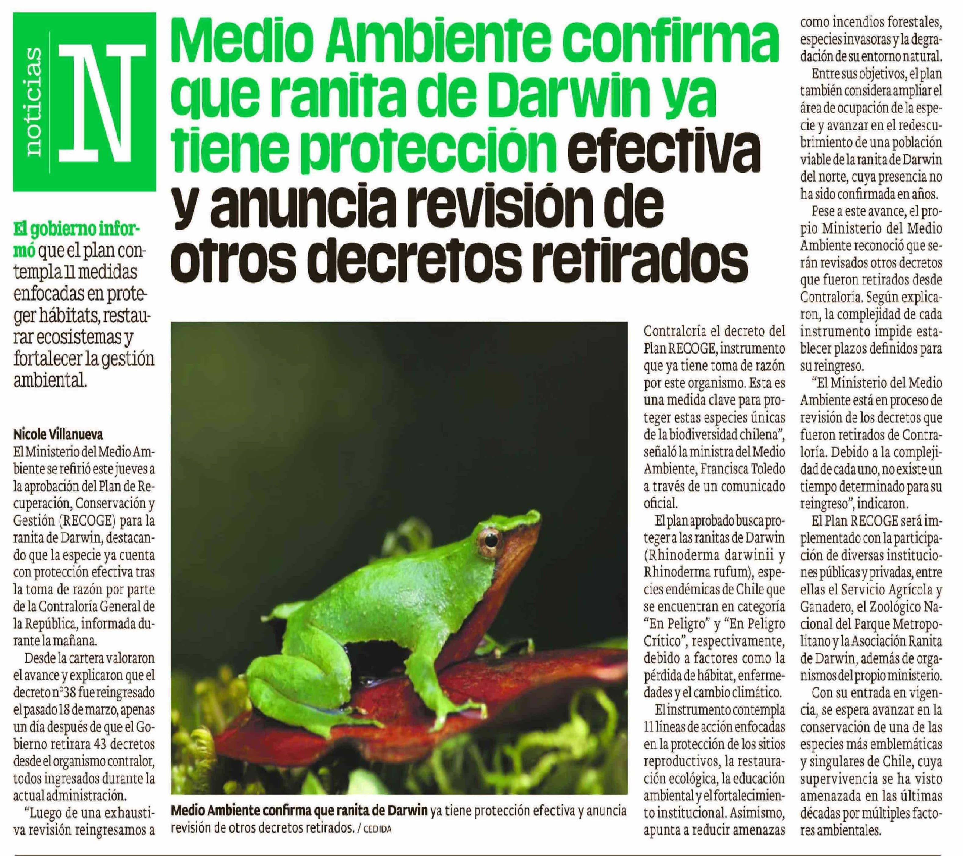 Medio Ambiente confirma que ranita de Darwin ya tiene protección efectiva y anuncia revision de otros decretos retirados
