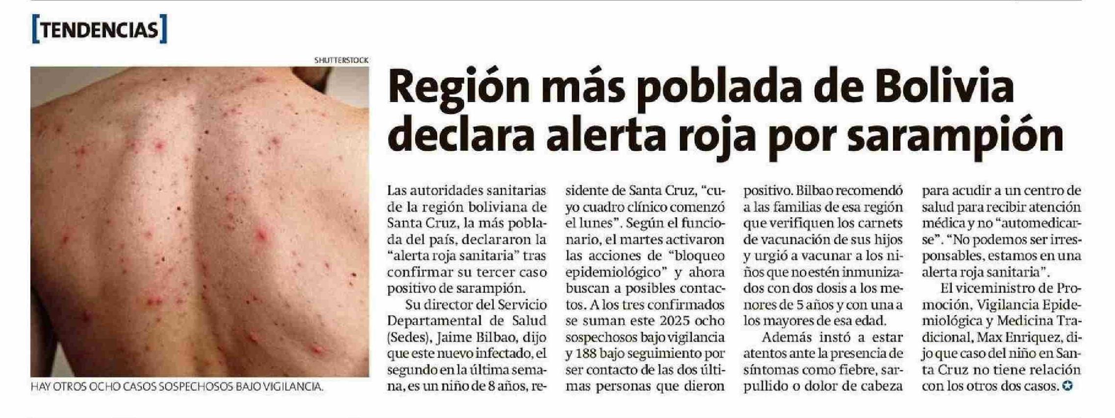 Región más poblada de Bolivia declara alerta roja por sarampión