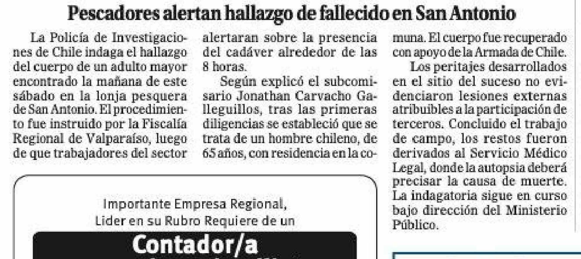 Pescadores alertan hallazgo de fallecido en San Antonio