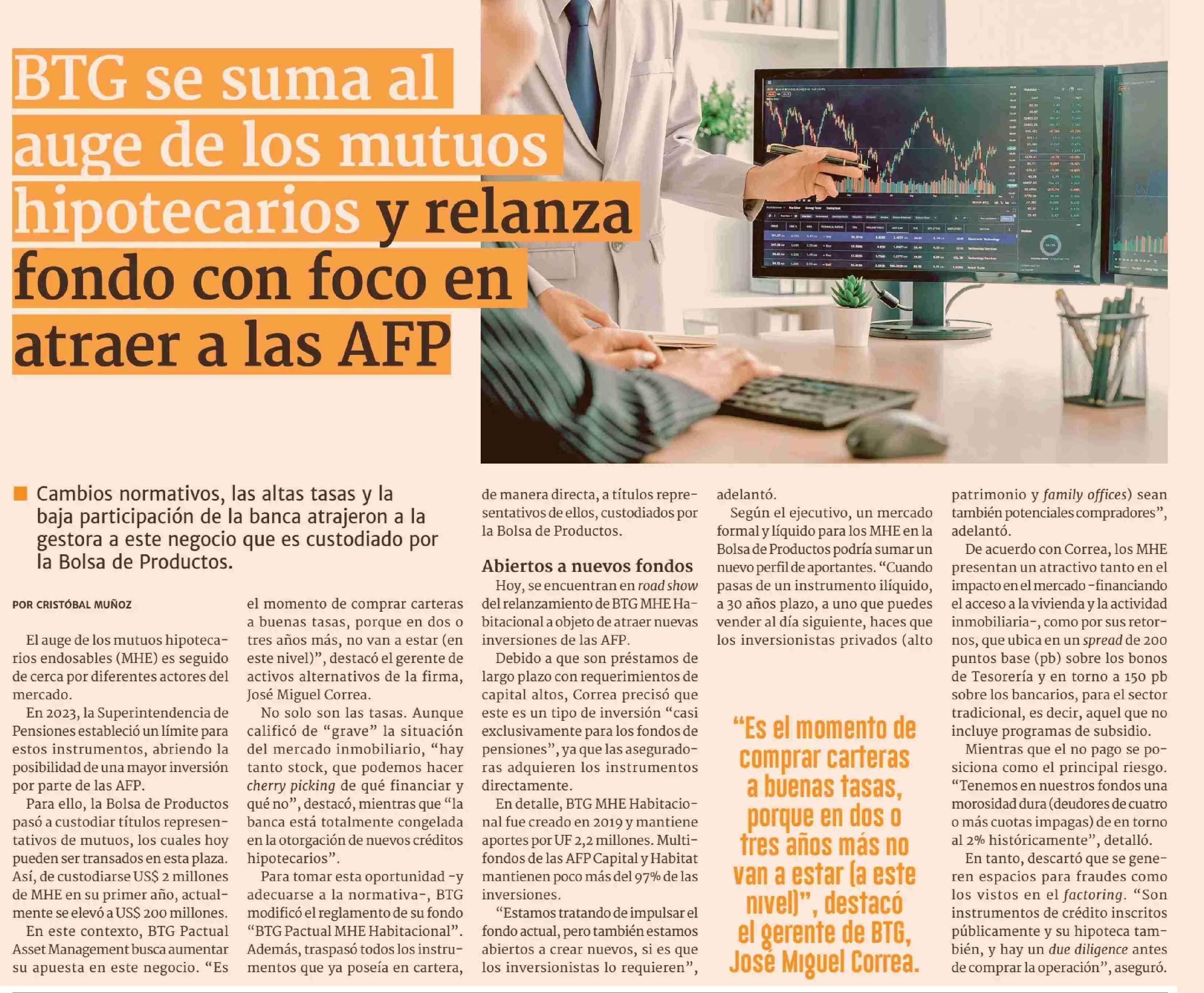 BTG se suma al auge de los mutuos hipotecarios y relanza fondo con foco en atraer a las AFP