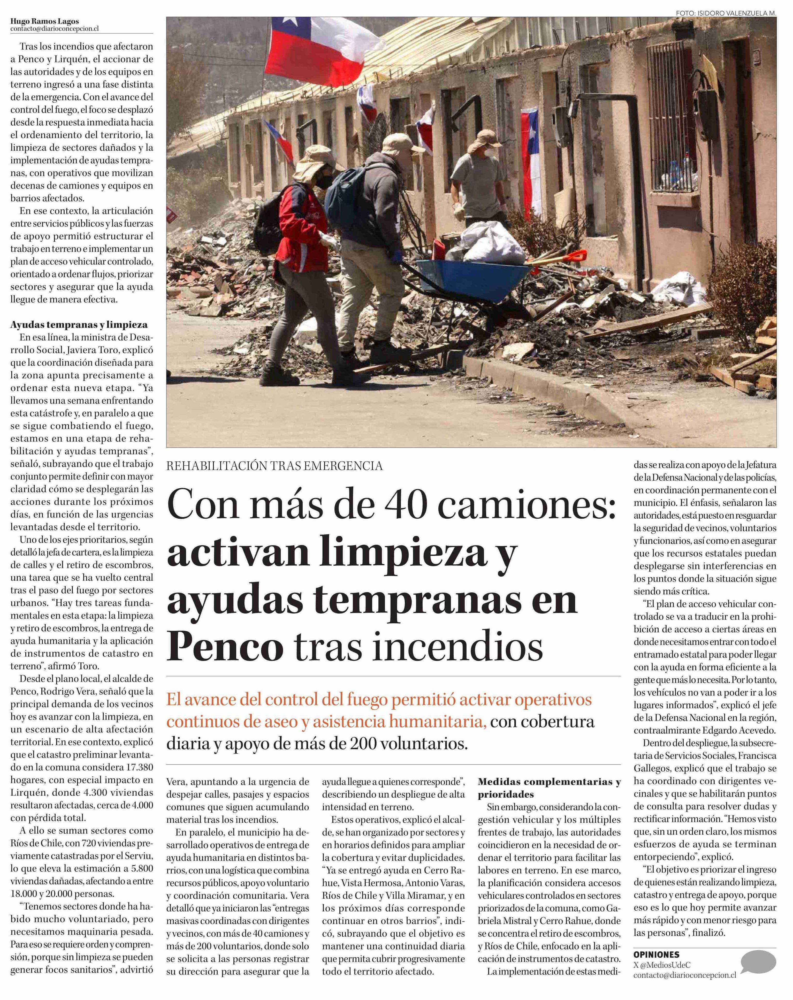 Con más de 40 camiones: activan limpieza y ayudas tempranas en Penco tras incendios