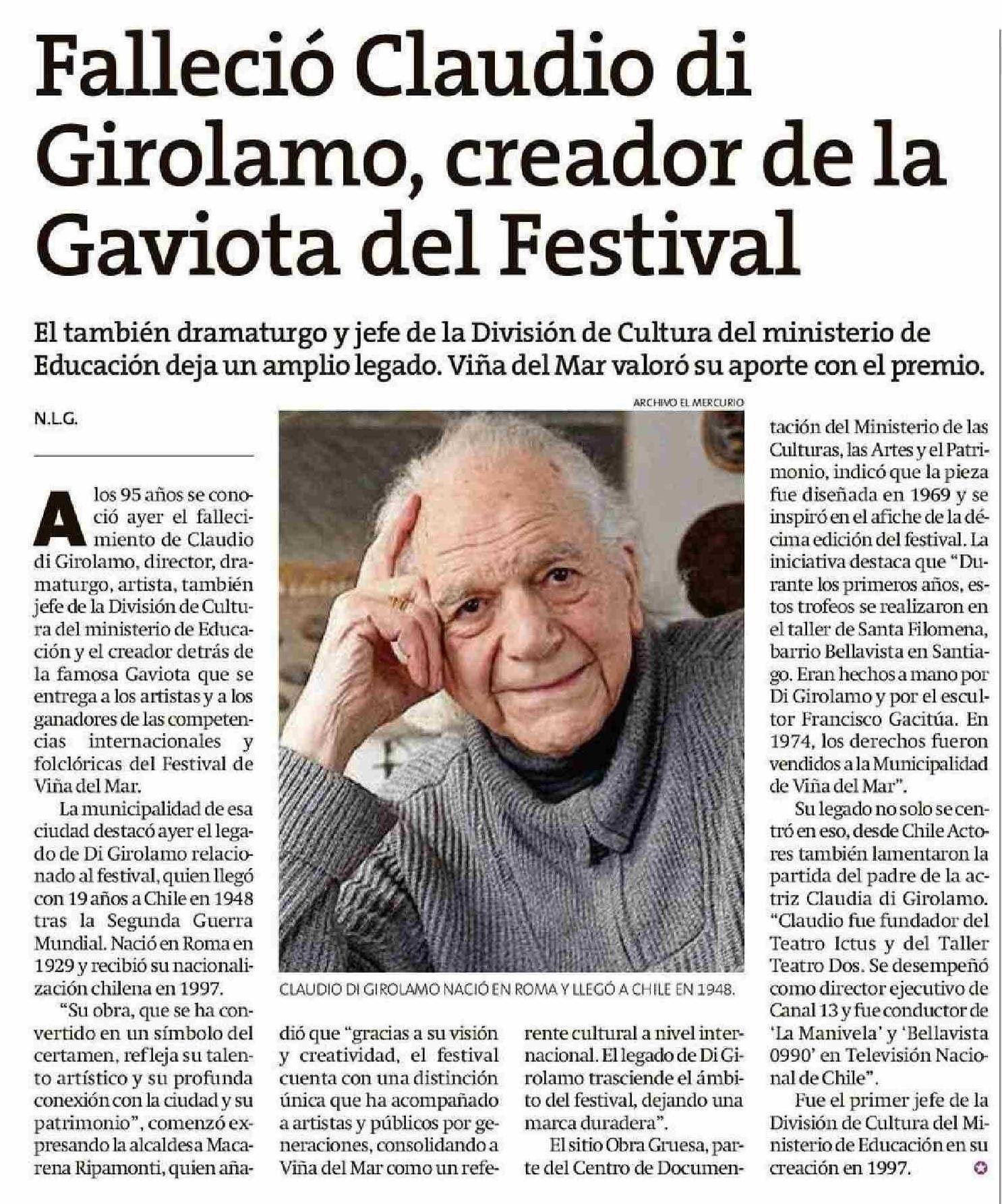 Falleció Claudio di Girolamo, creador de la Gaviota del Festival