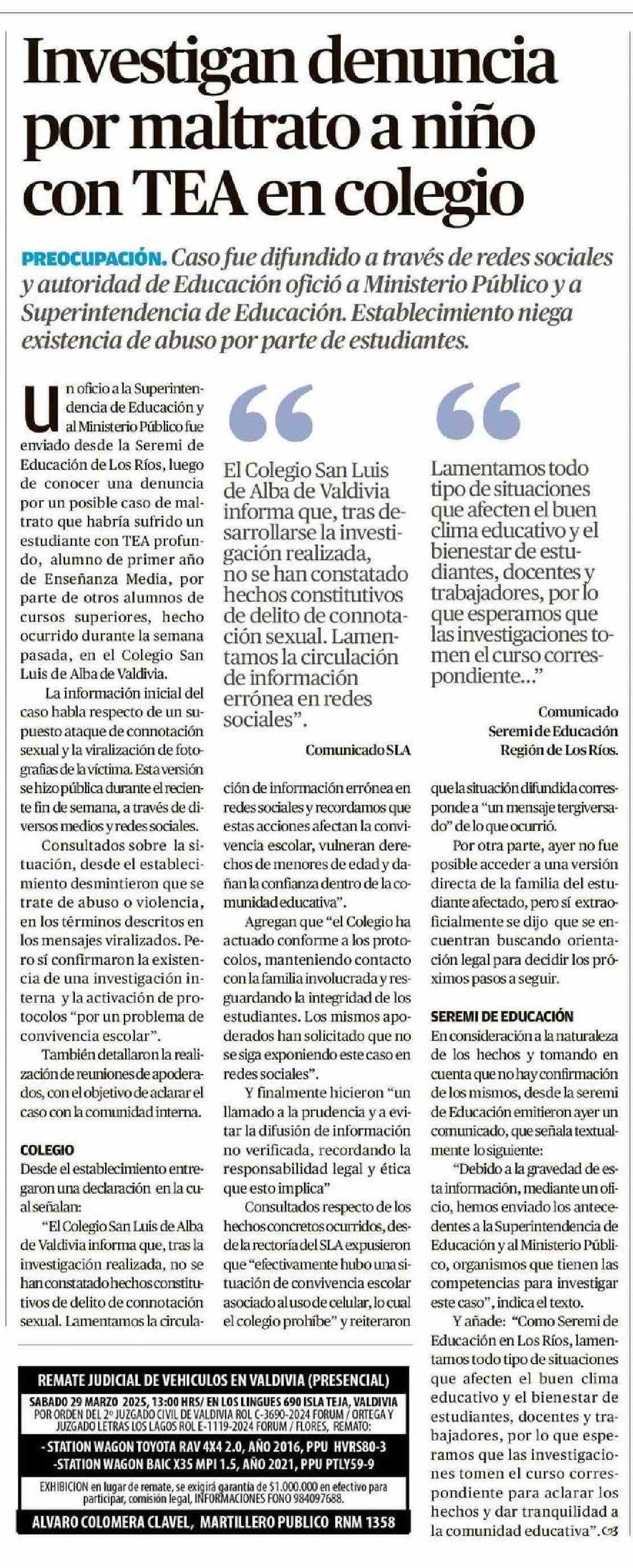 Investigan denuncia por maltrato a niño con TEA en colegio