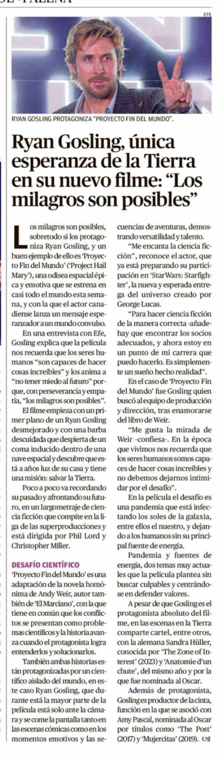 Ryan Gosling, única esperanza de la Tierra en su nuevo filme: "Los milagros son posibles"