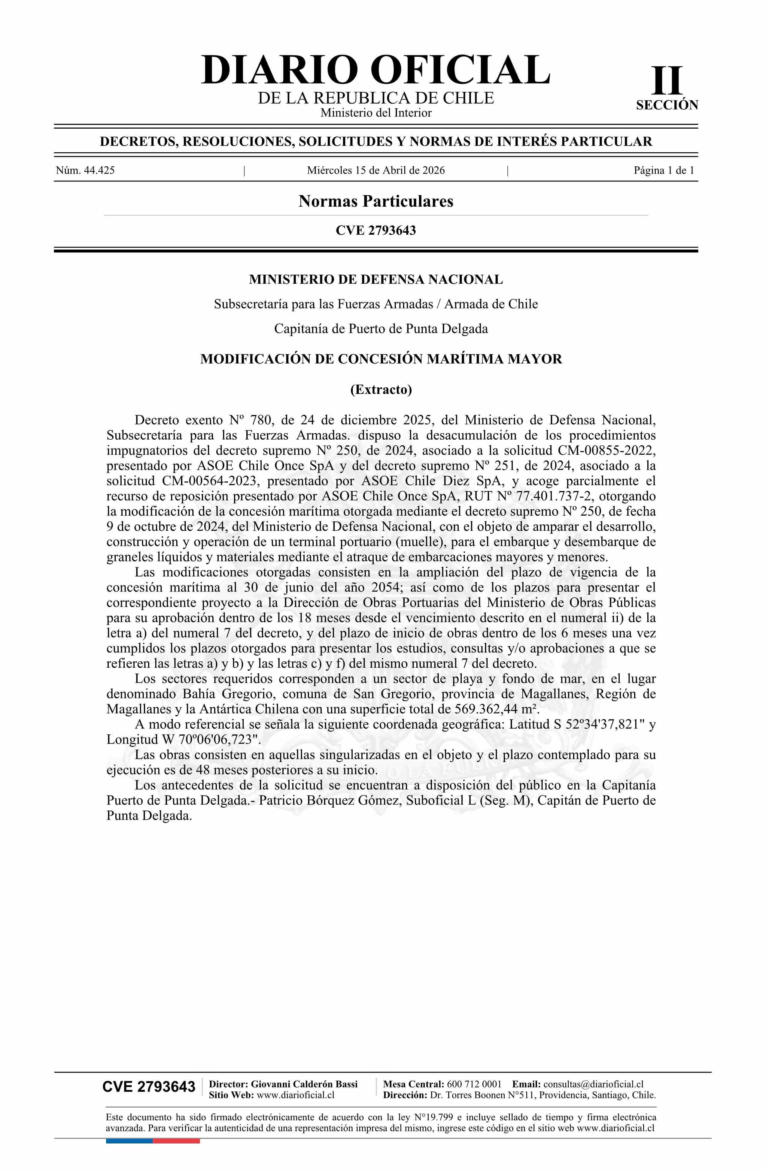 | Título: | Extracto de decreto exento número 780, de 2025.- Modificación de concesión marítima mayor |