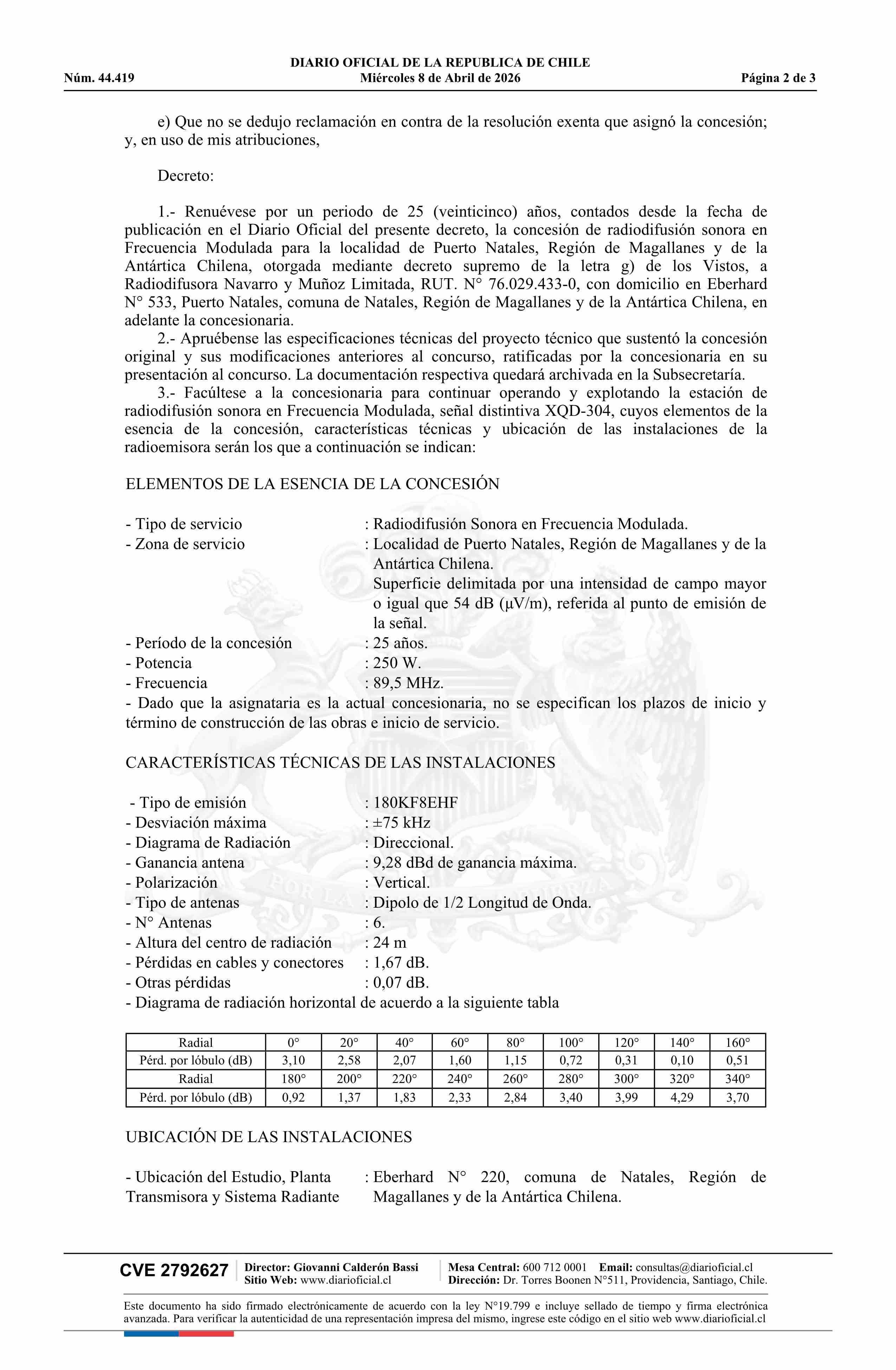 | Título: | Decreto exento número 203, de 2026.- Renueva concesión de radiodifusión sonora en frecuencia modulada para la localidad de Puerto Natales |
