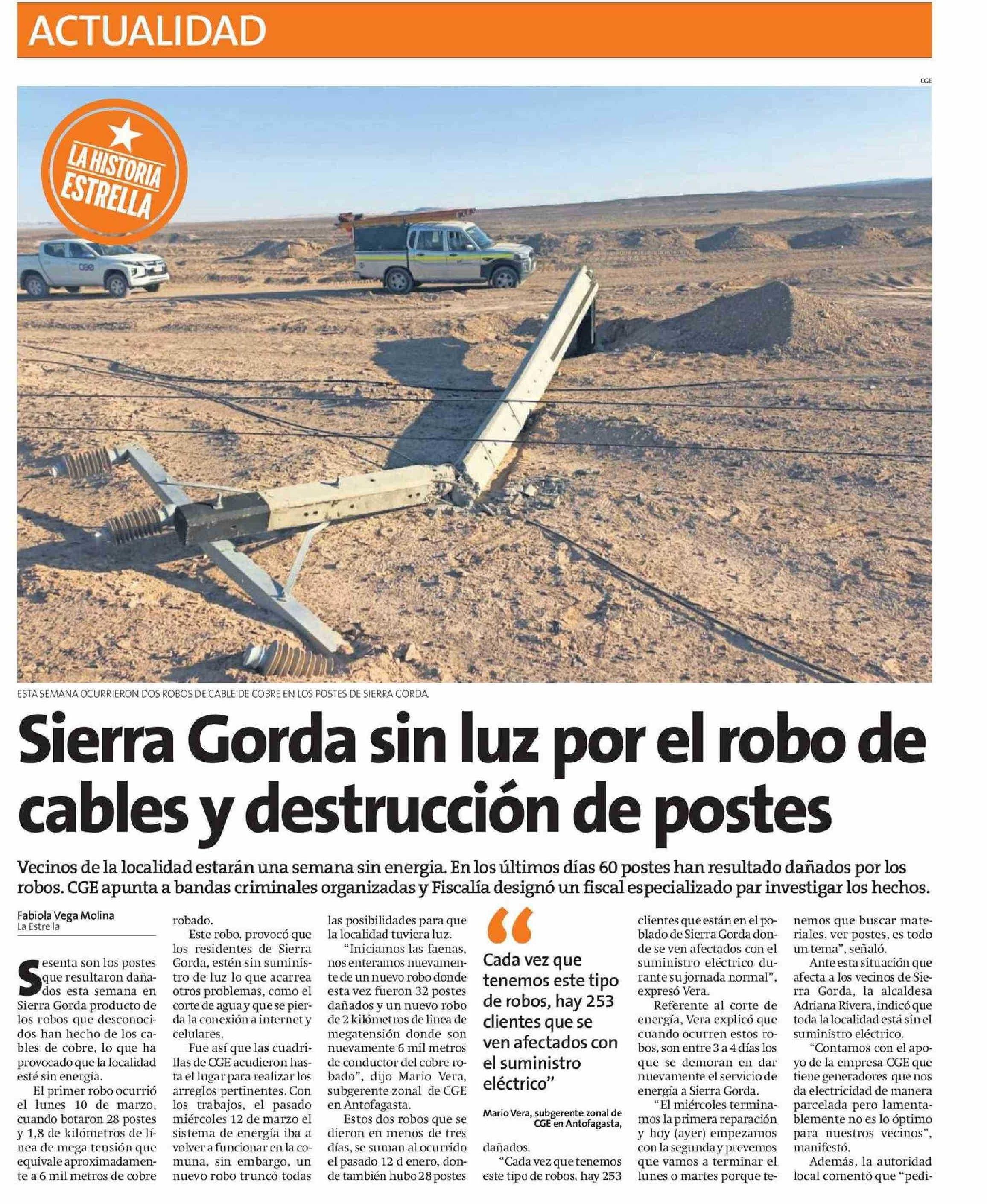 Sierra Gorda sin luz por el robo de cables y destrucción de postes