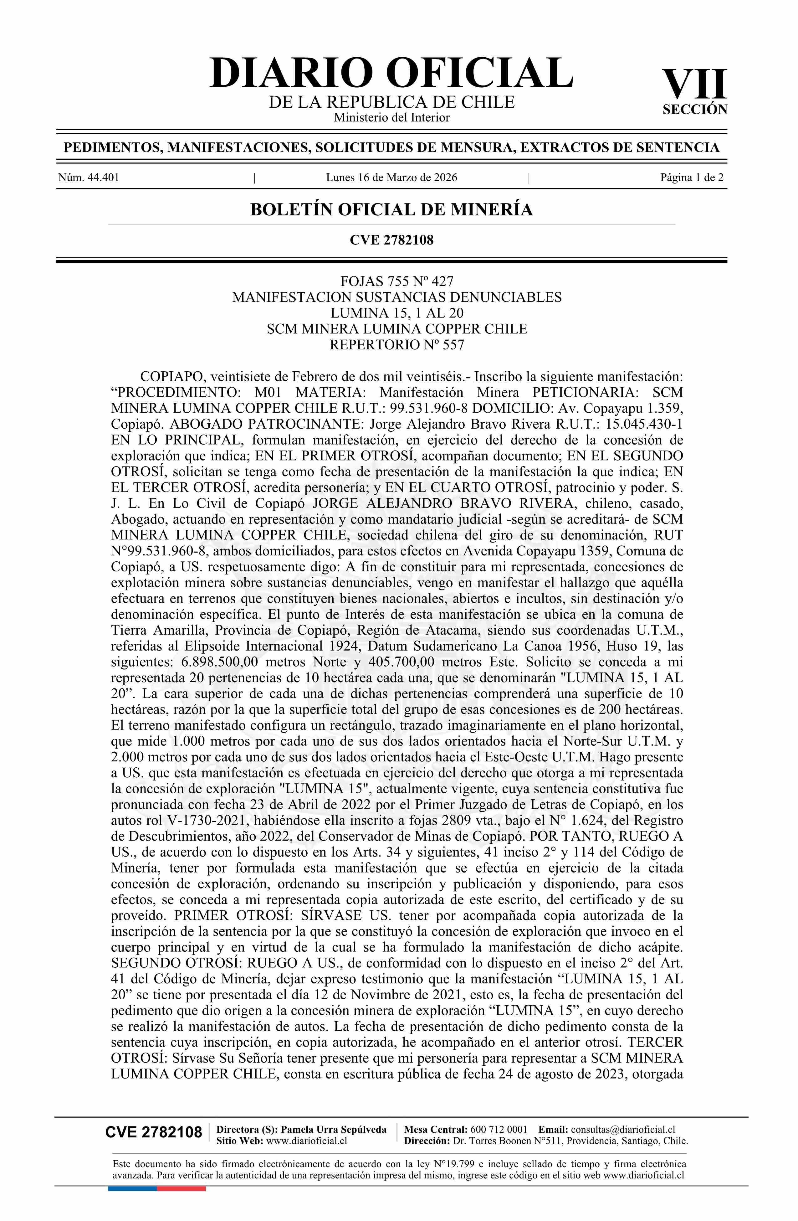 LUMINA 15, 1 AL 20 / SCM Minera Lumina Copper Chile