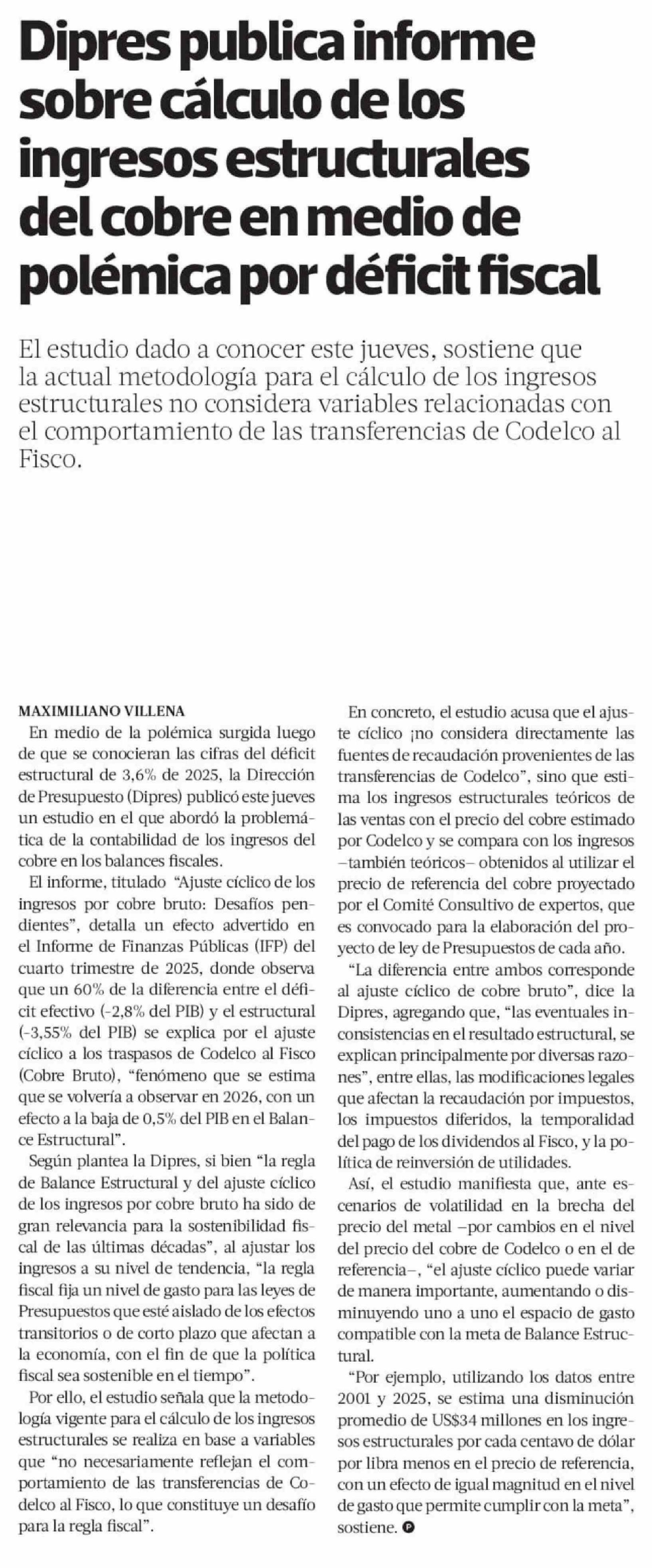Dipres publica informe sobre cálculo de los ingresos estructurales del cobre en medio de polémica por déficit fiscal
