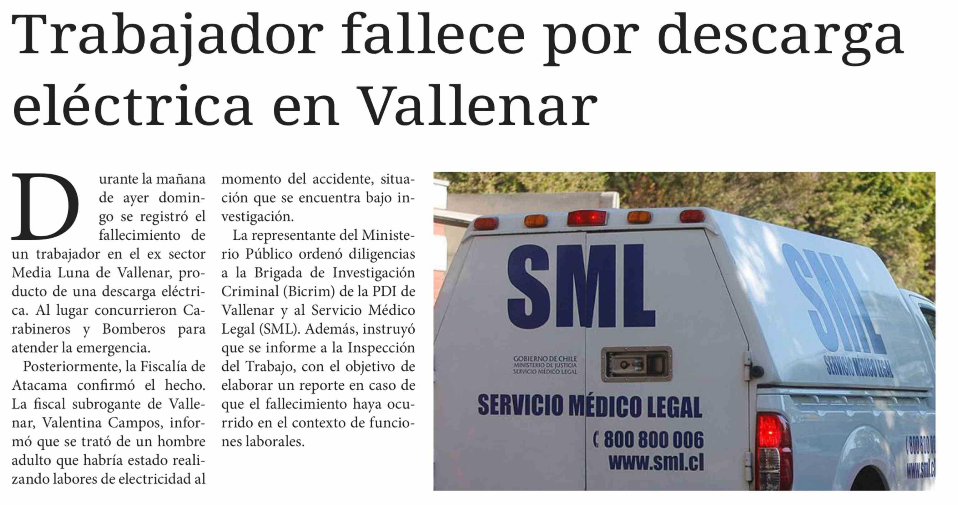 Trabajador fallece por descarga eléctrica en Vallenar