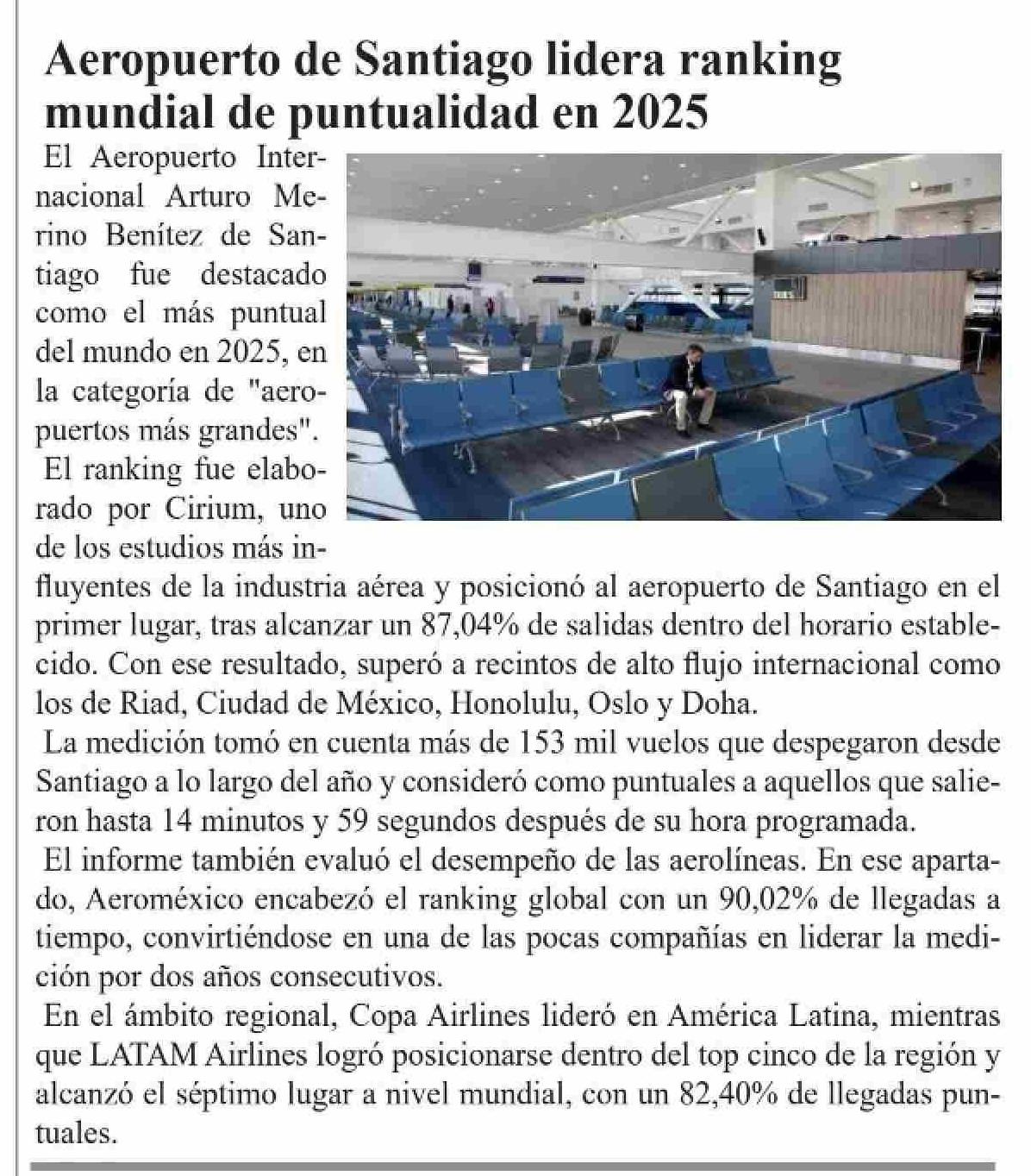 Aeropuerto de Santiago lidera ranking mundial de puntualidad en 2025