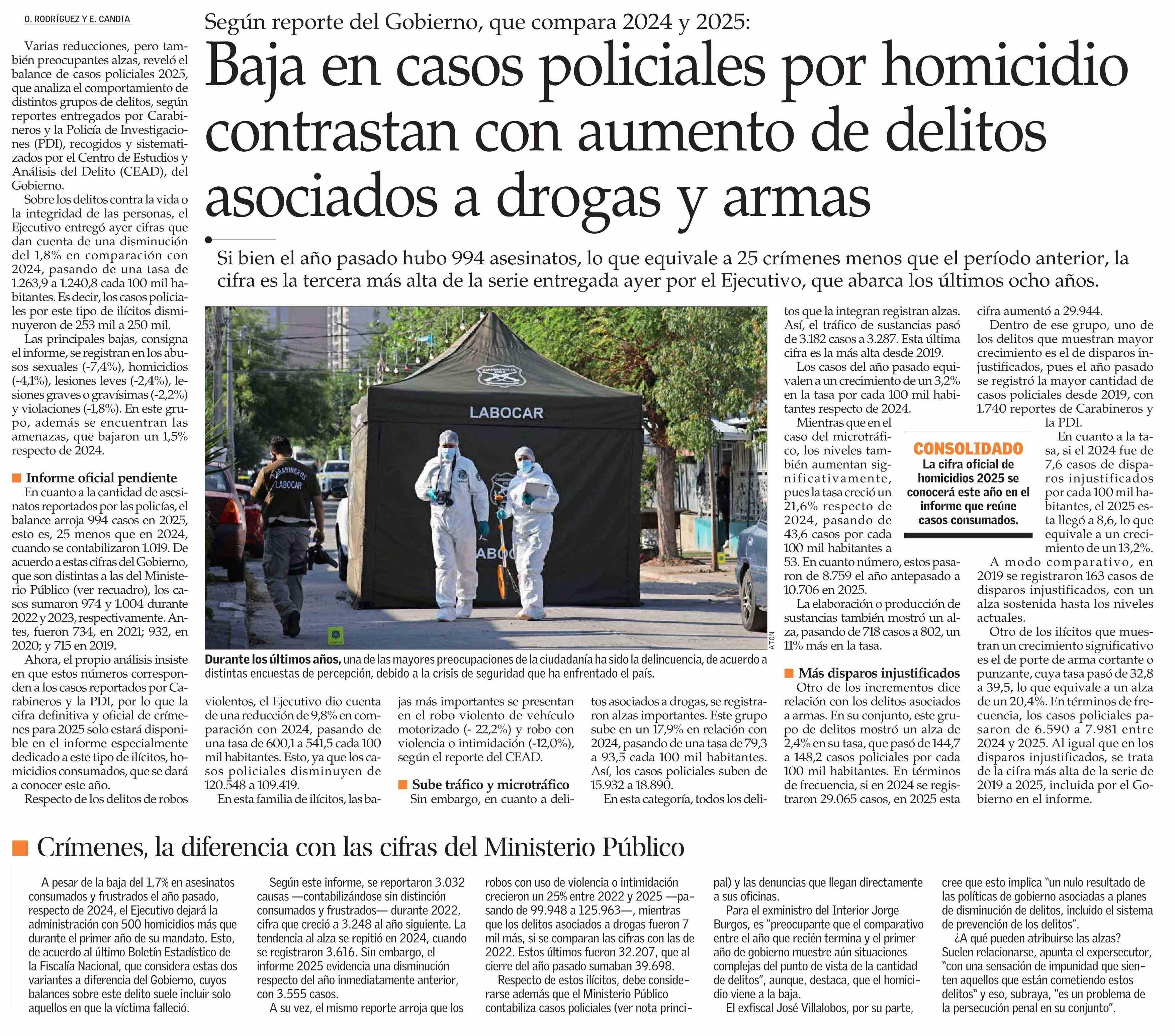 Baja en casos policiales por homicidio contrastan con aumento de delitos asociados a drogas y armas