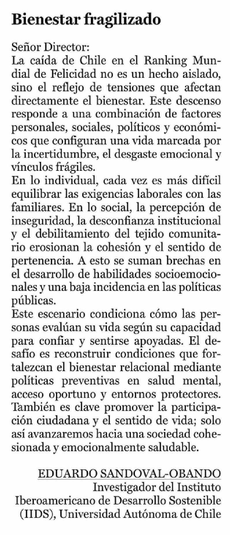 Cartas: Bienestar fragilizado