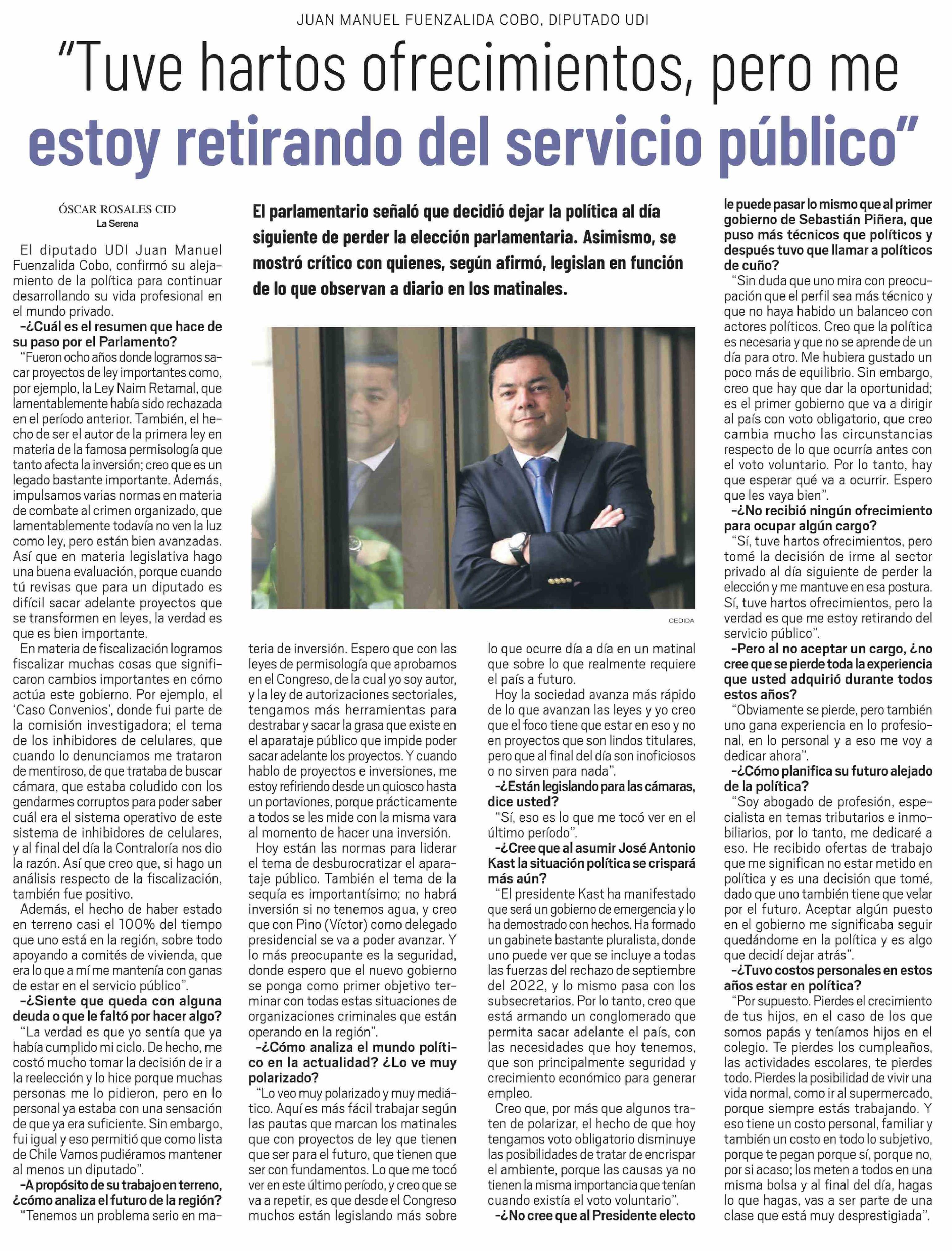 "Tuve hartos ofrecimientos, pero me estoy retirando del servicio público"