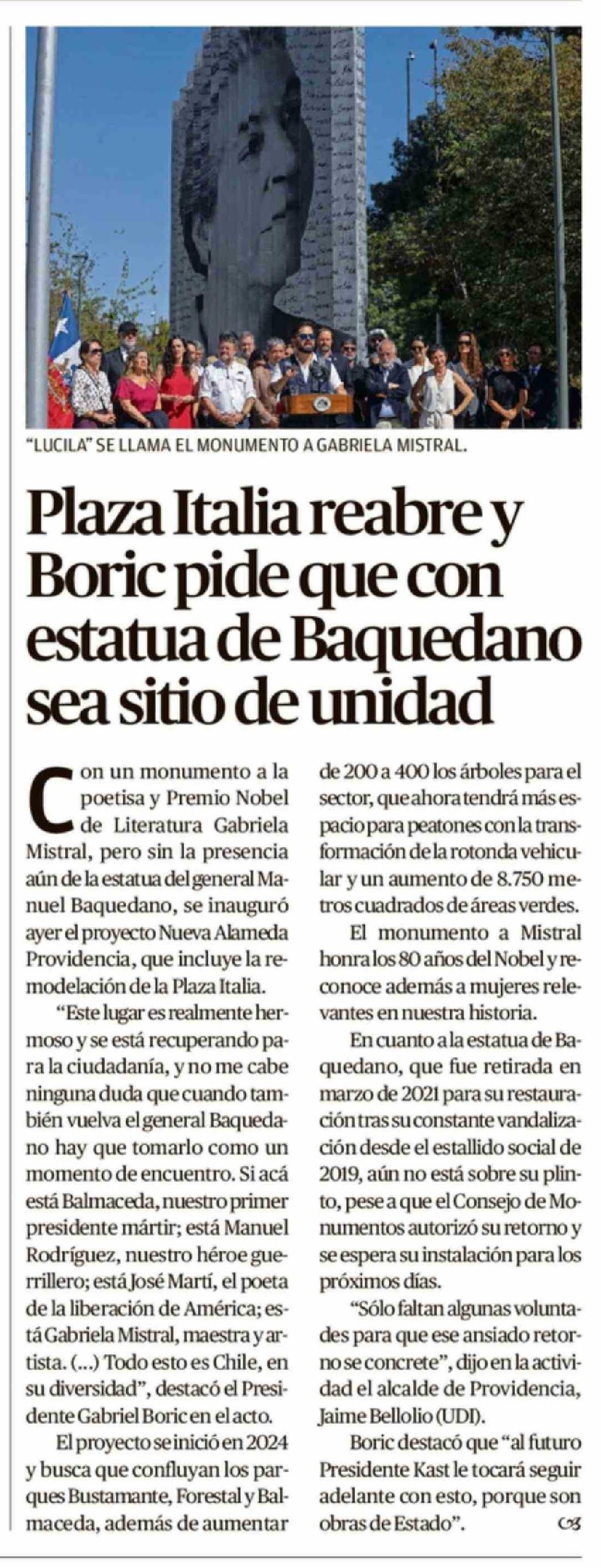 Plaza Italia reabre y Boric pide que con estatua de Baquedano sea sitio de unidad