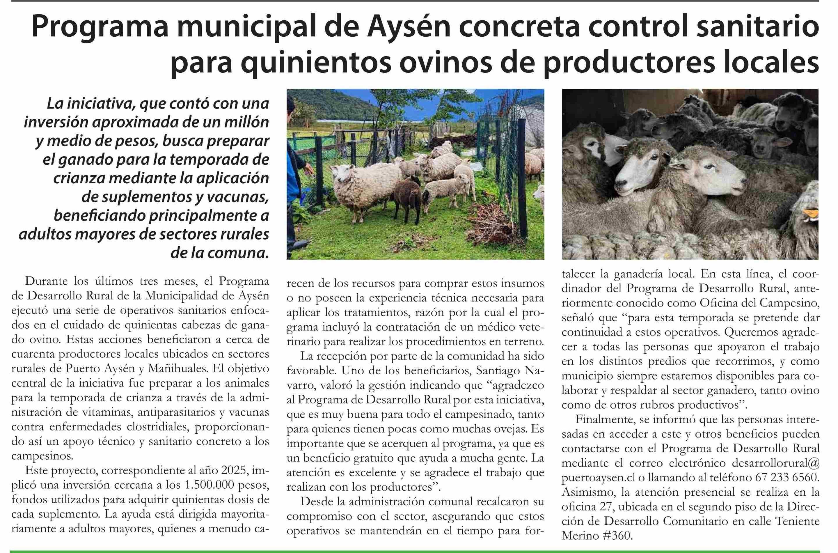 Título: Programa municipal de Aysén concreta control sanitario para quinientos ovinos de productores locales