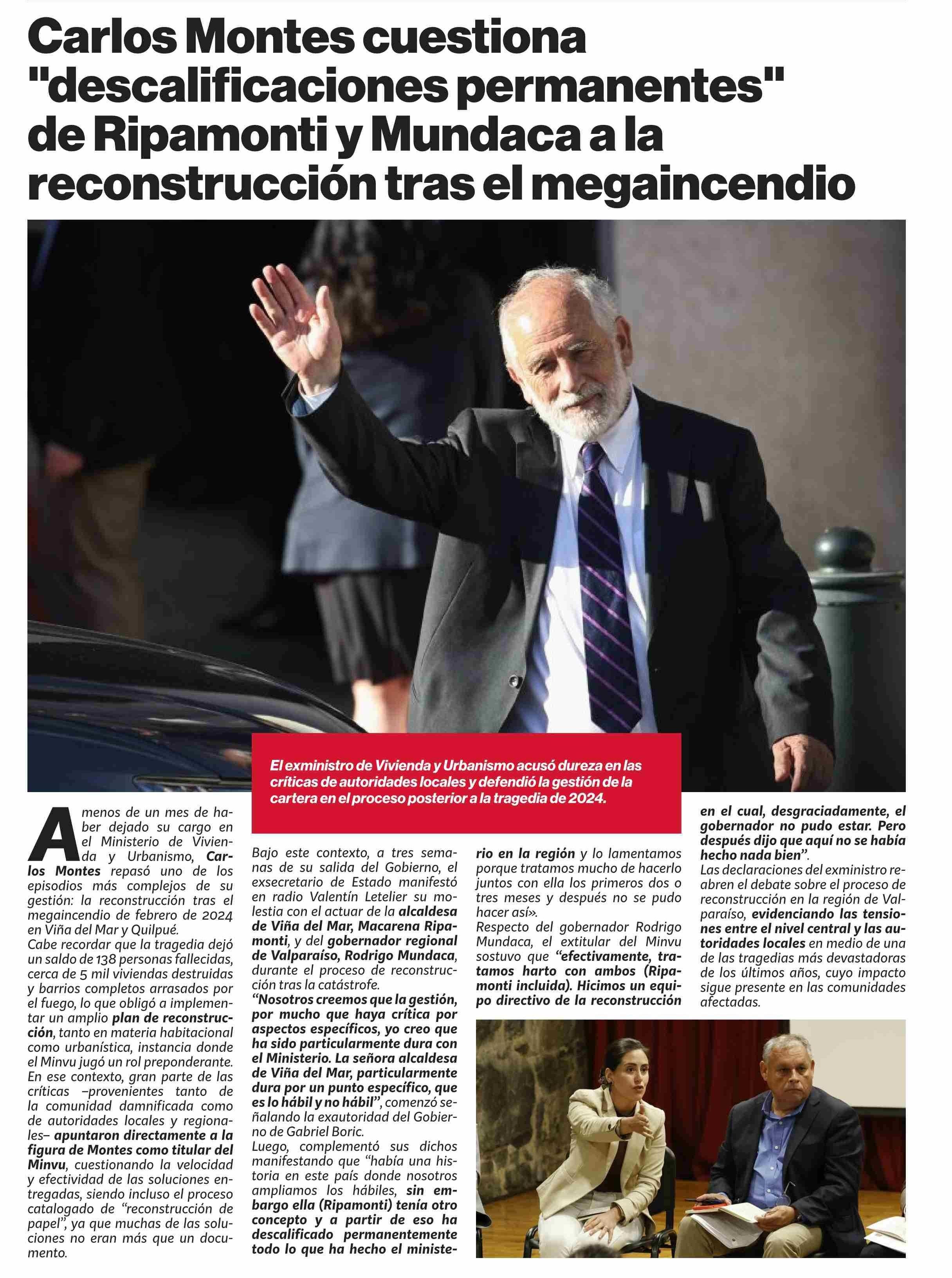 Carlos Montes cuestiona "descalificaciones permanentes” de Ripamonti y Mundaca a la reconstrucción tras el megaincendio