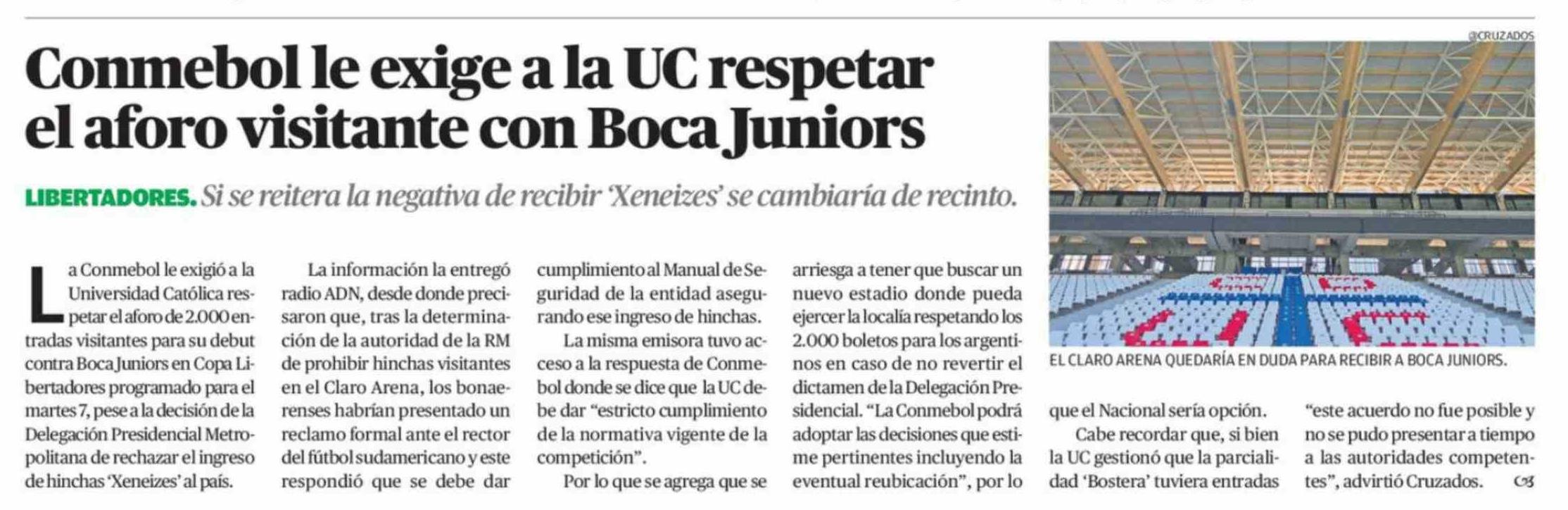 Conmebol le exige a la UC respetar el aforo visitante con Boca Juniors