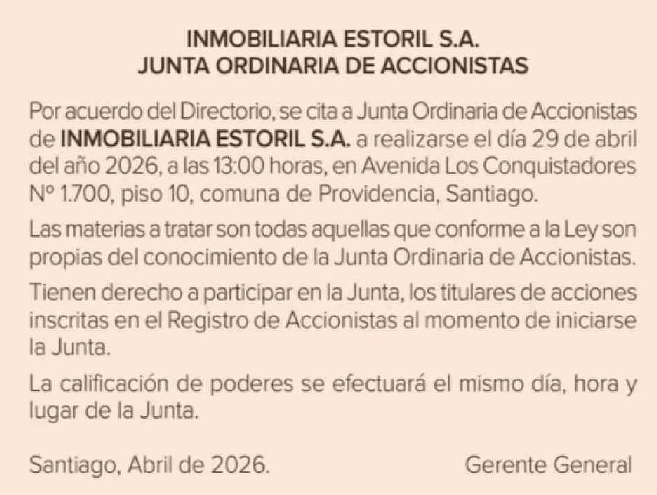 AVISO INMOBILIARIA ESTORIL S.A. JUNTA ORDINARIA DE ACCIONISTAS