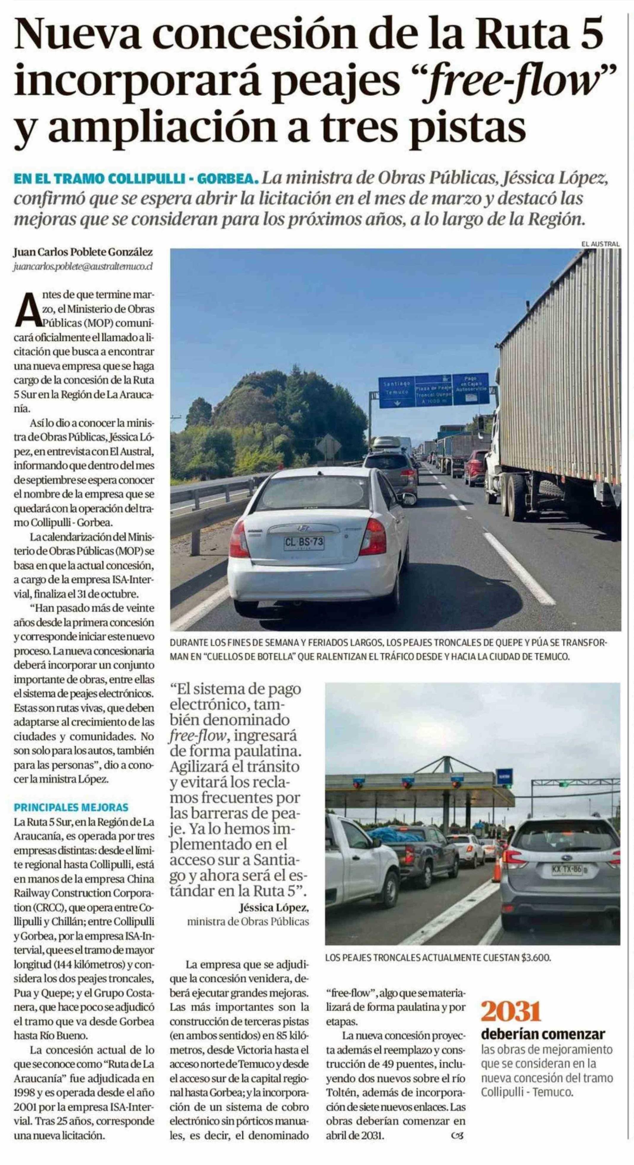 Nueva concesión de la Ruta 5 incorporará peajes "free-flow" y ampliación a tres pistas