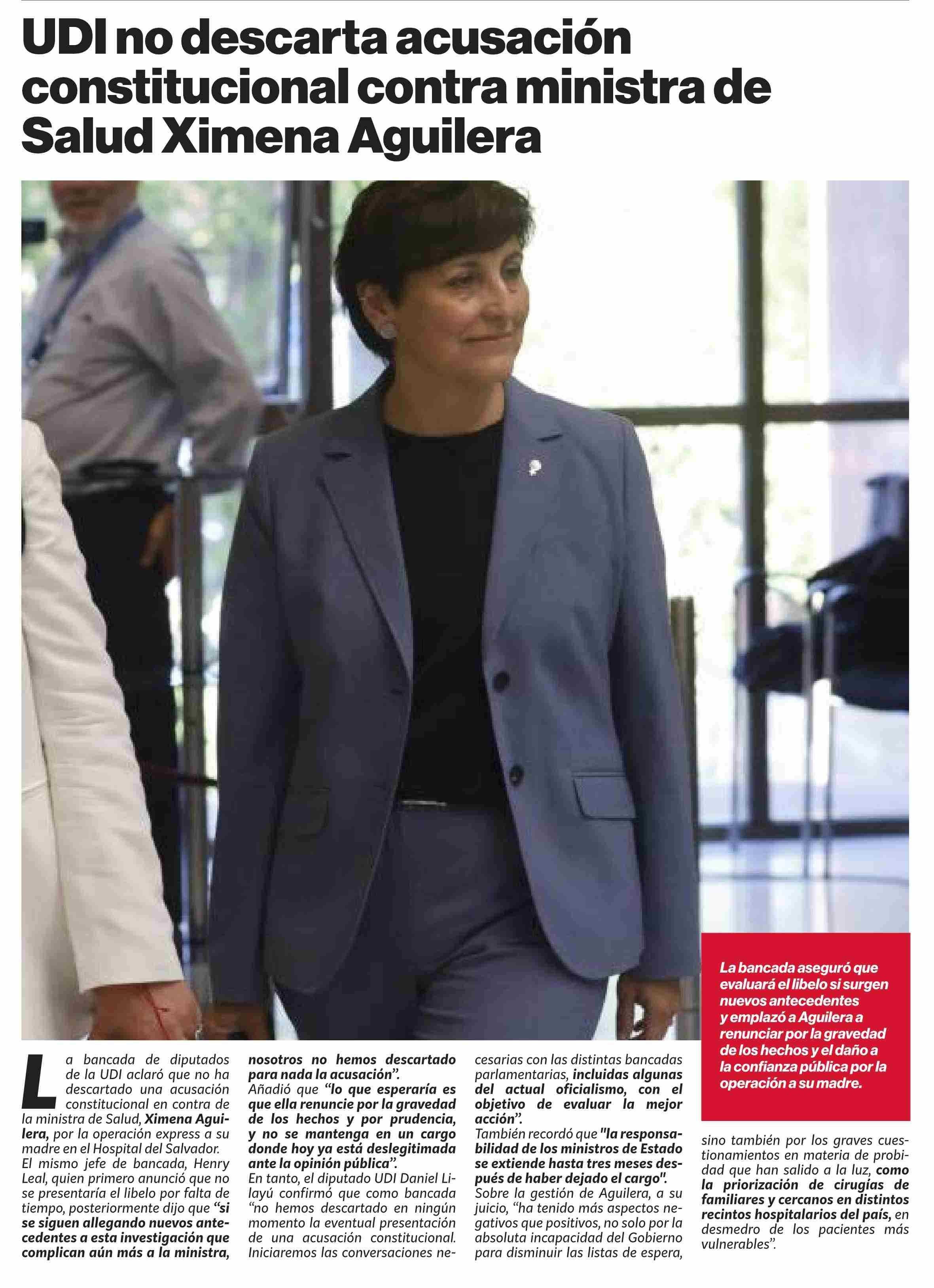 UDI no descarta acusación constitucional contra ministra de Salud Ximena Aguilera