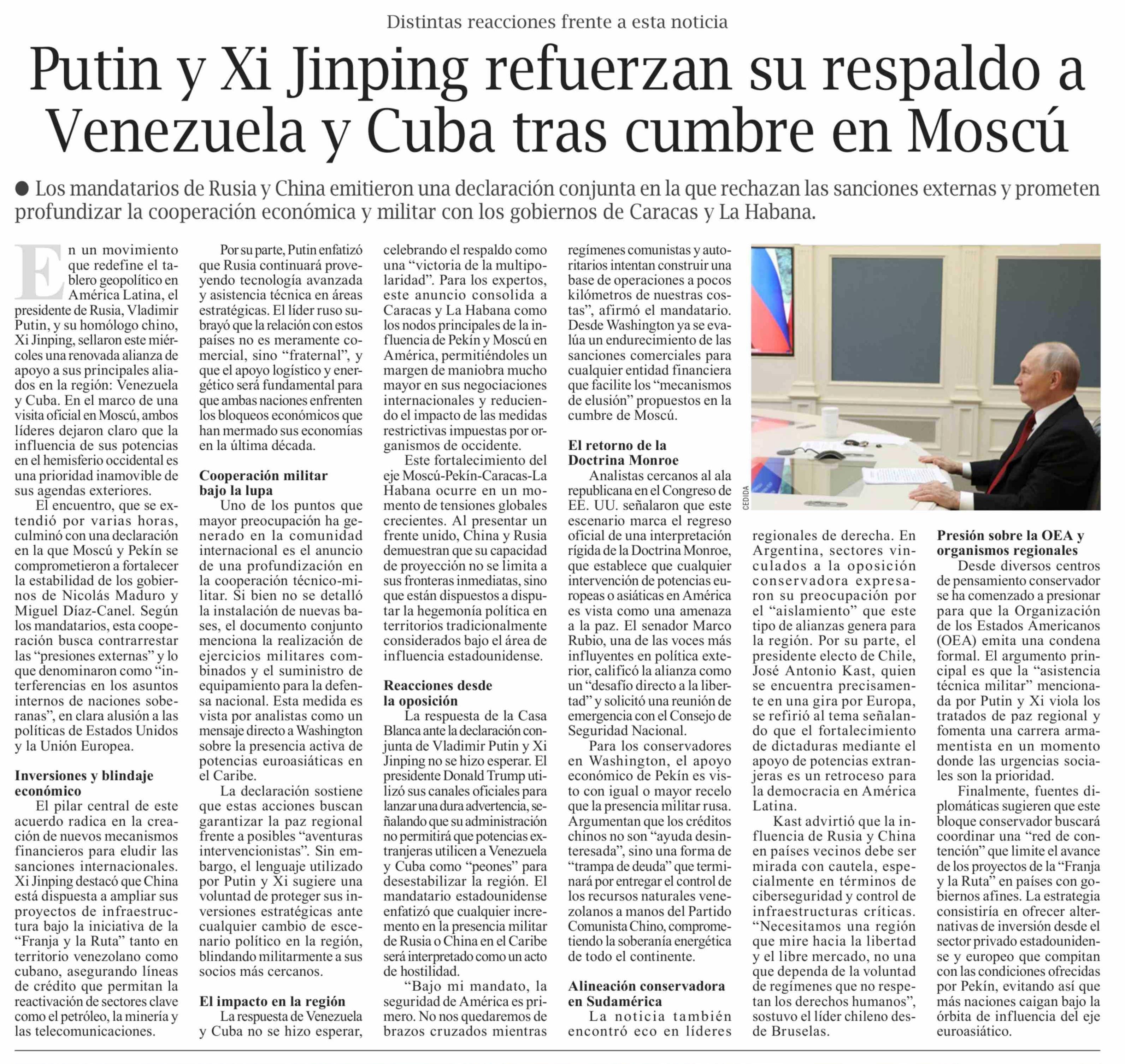 Putin y Xi Jinping refuerzan su respaldo a Venezuela y Cuba tras cumbre en Moscú