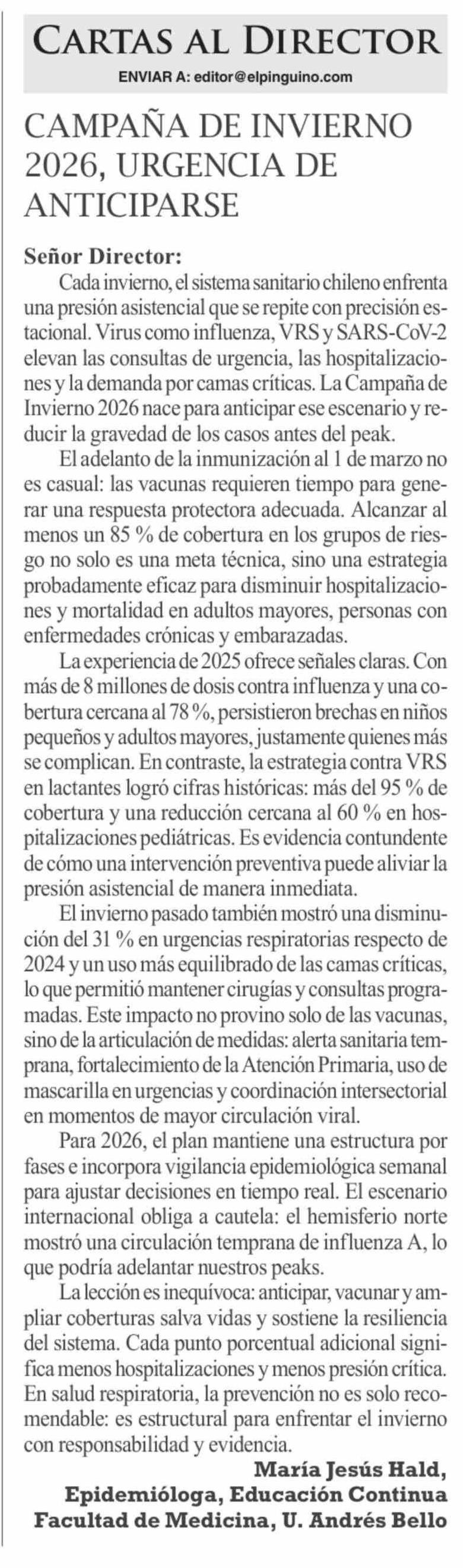 Cartas: CAMPAÑA DE INVIERNO 2026, URGENCIA DE ANTICIPARSE