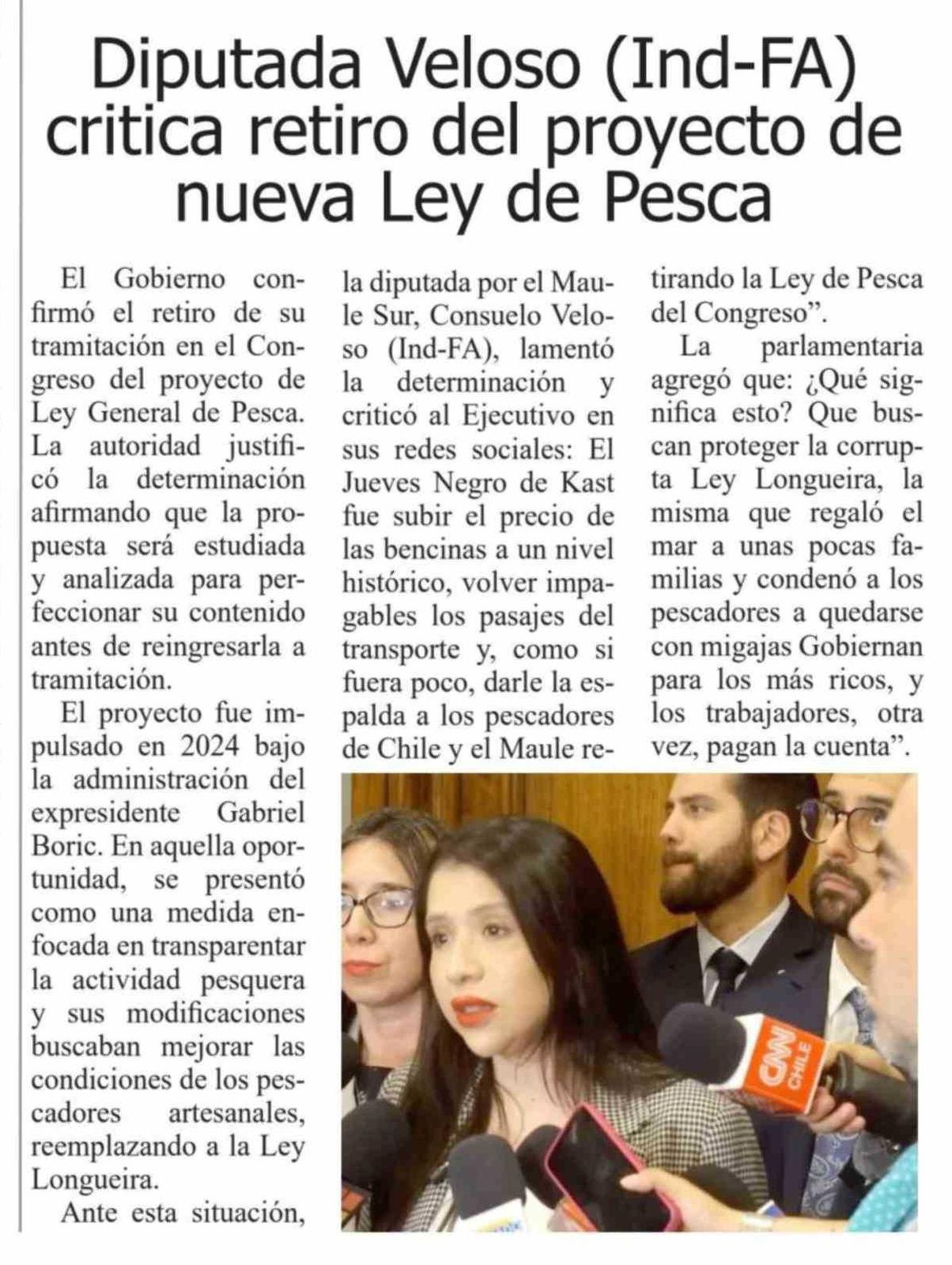 Diputada Veloso (Ind-FA) critica retiro del proyecto de nueva Ley de Pesca
