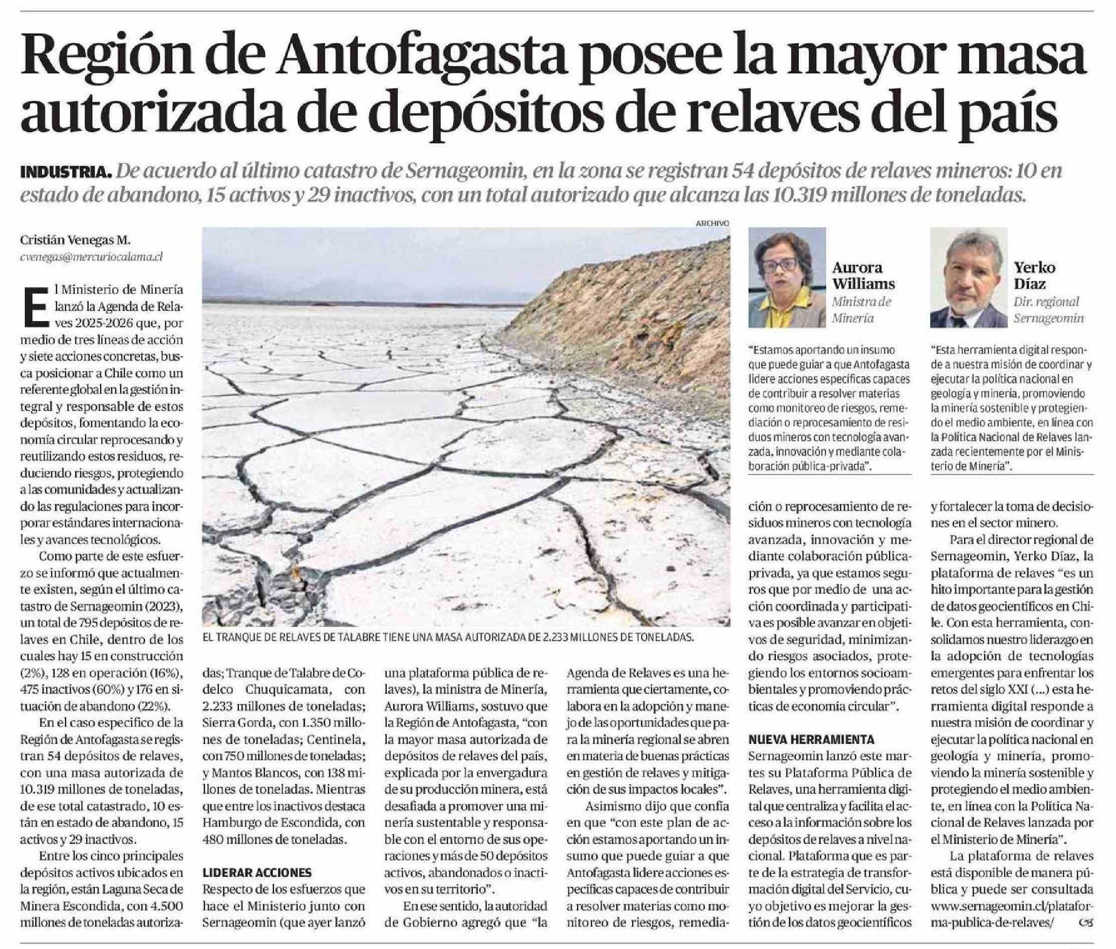 Región de Antofagasta posee la mayor masa autorizada de depósitos de relaves del país