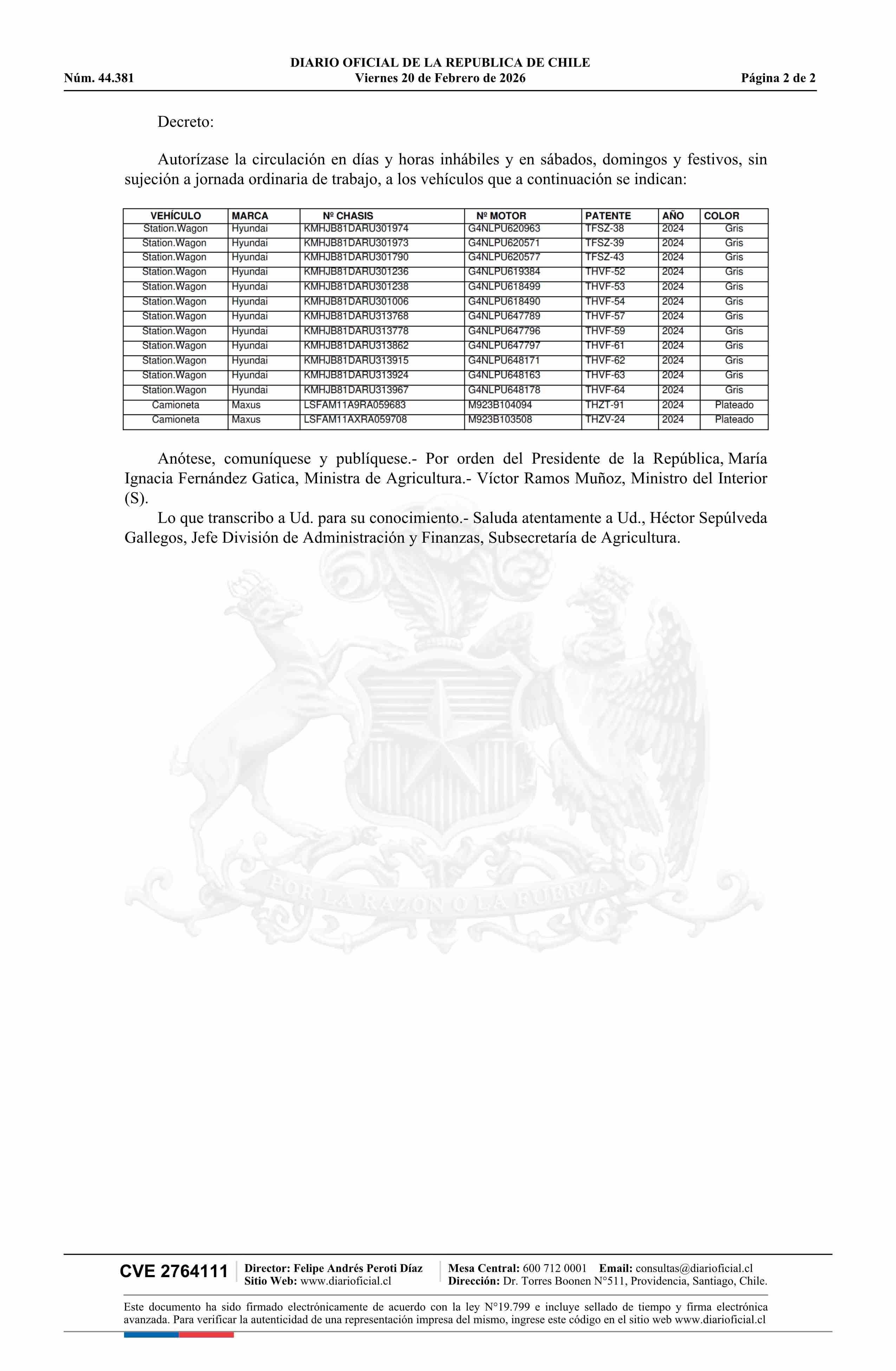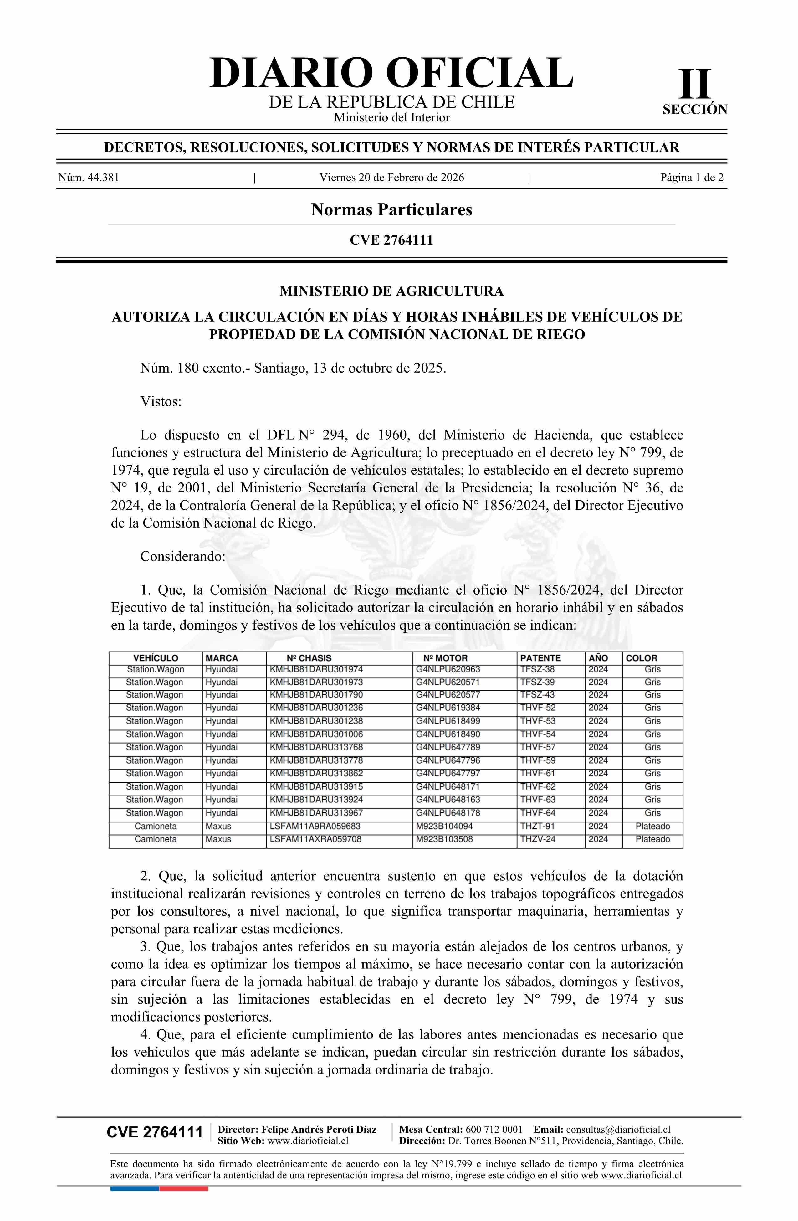 | Título: | Decreto exento número 180, de 2025.- Autoriza la circulación en días y horas inhábiles de vehículos de propiedad de la Comisión Nacional de Riego |