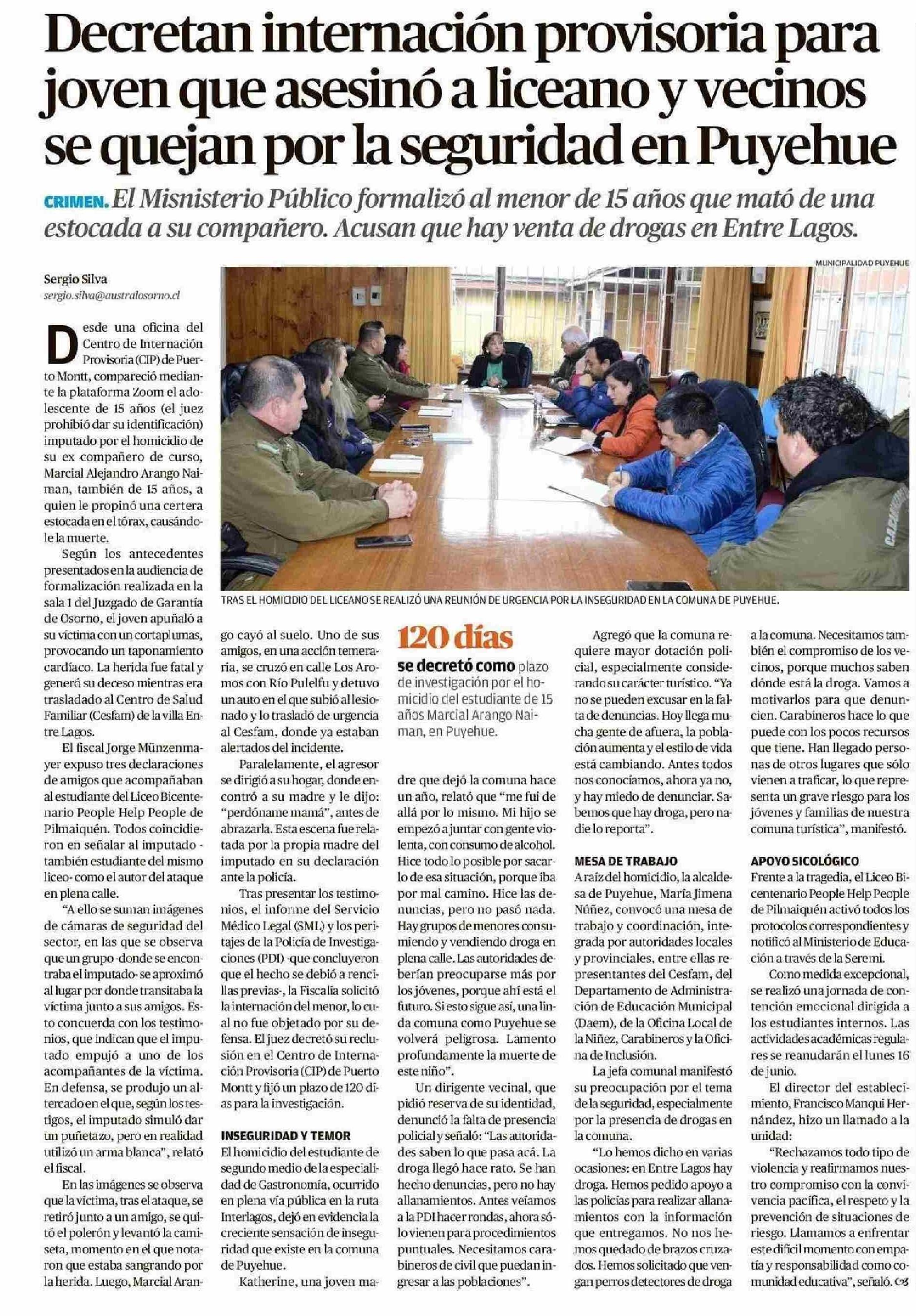 Decretan internación provisoria para joven que asesinó a liceano y vecinos se quejan por la seguridad en Puyehue