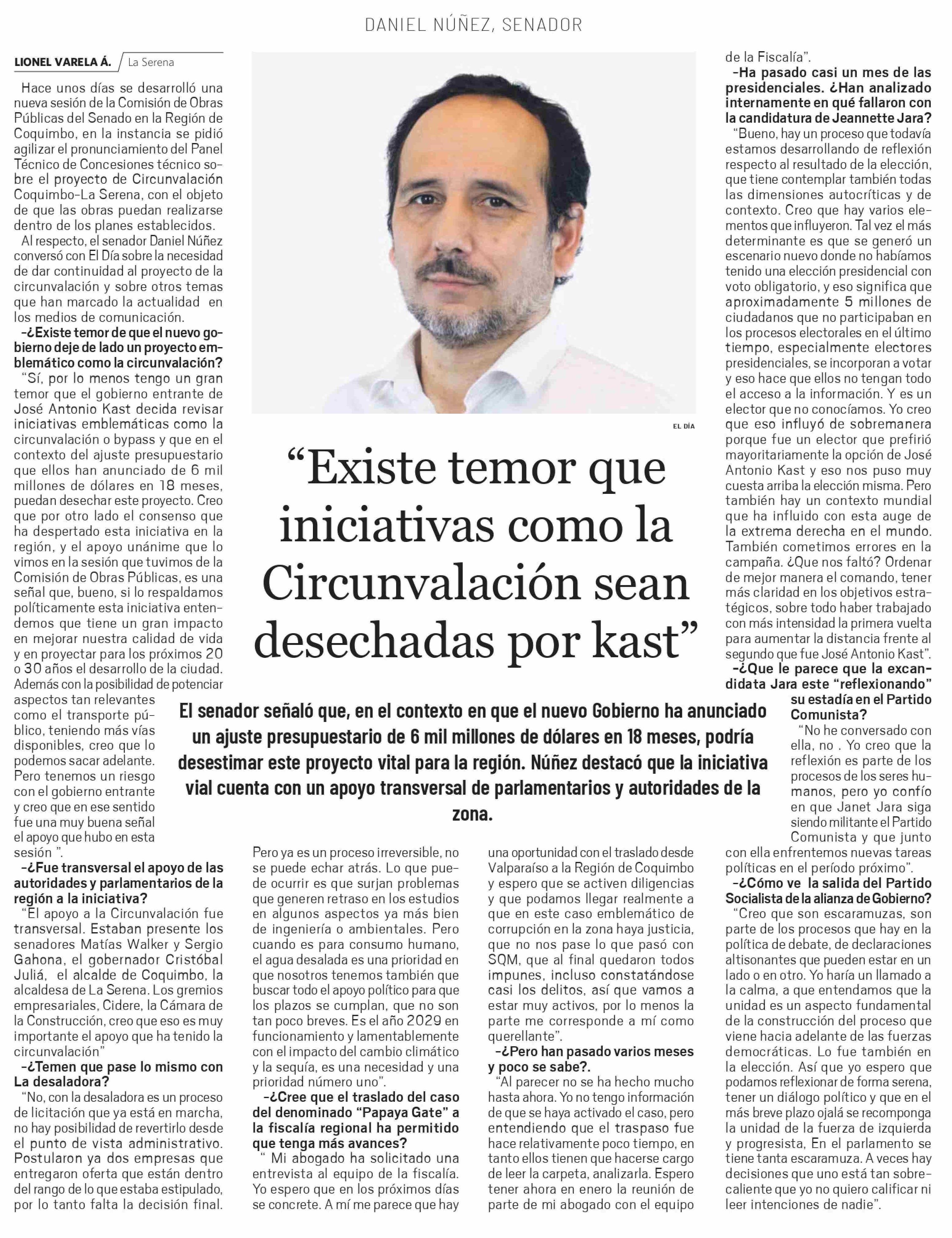 Título: "Existe temor que iniciativas como la Circunvalación sean desechadas por kast"