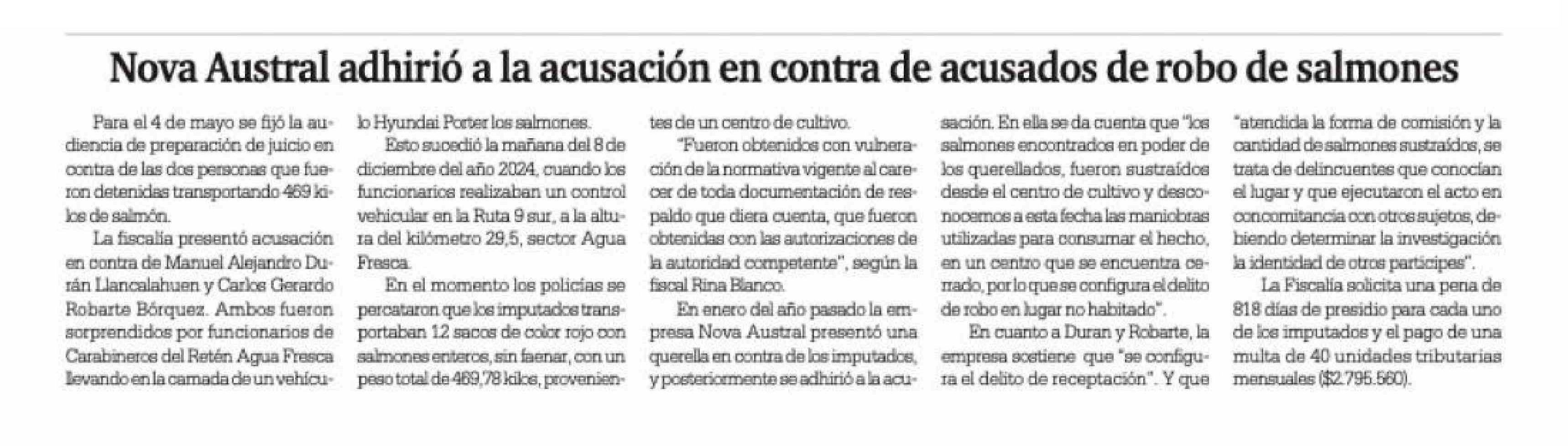 Nova Austral adhirió a la acusación en contra de acusados de robo de salmones