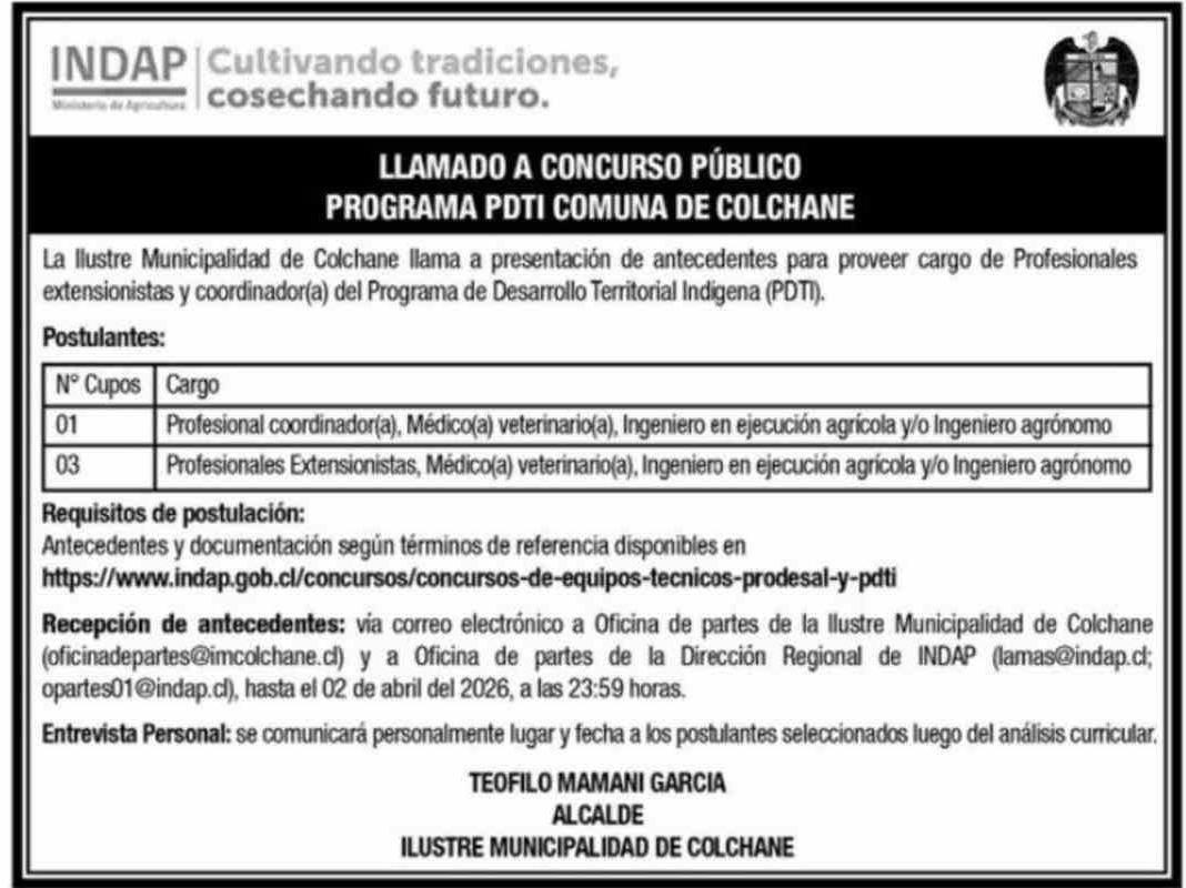 Extractos: INDAP | Cultivando tradiciones, cosechando futuro. LLAMADO A CONCURSO PÚBLICO PROGRAMA PDTI COMUNA DE COLCHANE