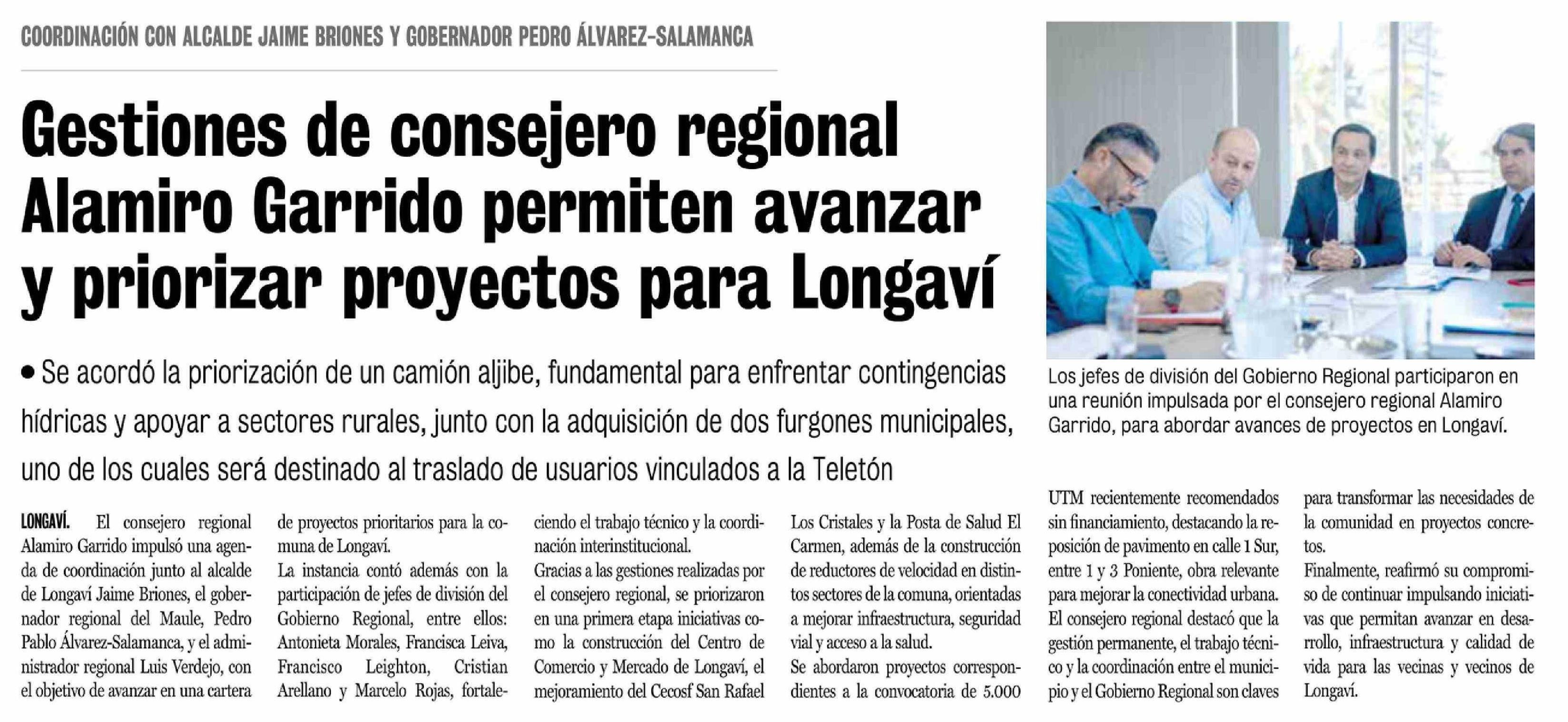 Gestiones de consejero regional Alamiro Garrido permiten avanzar y priorizar proyectos para Longaví