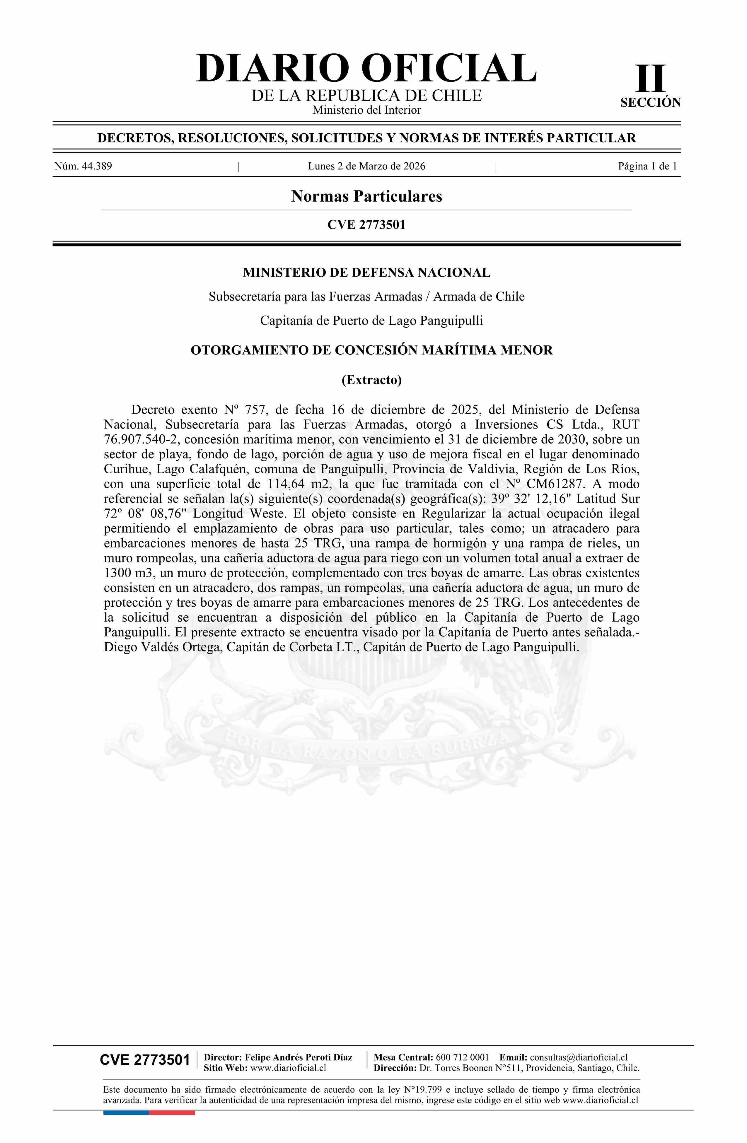 | Título: | Extracto de decreto exento número 757, de 2025.- Otorgamiento de concesión marítima menor |