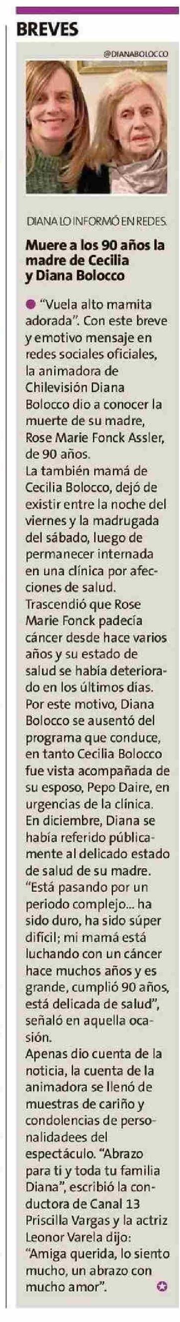 Muere a los 90 años la madre de Cecilia y Diana Bolocco